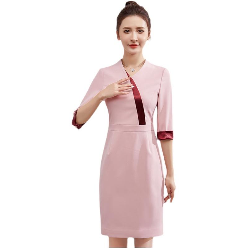 エステ ユニフォーム ワンピース 五分袖 春秋 制服 サロン ホテル フロント 受付 レディース ピンク グレー 無地 膝上 ポケット カシュクール ウエストマーク スリット 速乾 ストレッチ 通気性 大きめサイズ おしゃれ