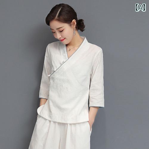 ・カテゴリ: カジュアルセットアップ・スタイル: レトロカジュアル、チャイナ風、エレガント・対象: レディース・主な素材: 綿ポリエステル混紡・主な素材成分率: 30%以下・セットアップ形式: パンツスタイル・パンツ丈: フルレングス・袖丈: 七分袖・袖タイプ: レギュラー・柄: 無地・加工: パイピング・カラー展開: ホワイト、ピンク、ライトブルー、ブラック・サイズ展開: S、M、L、XL、XXL