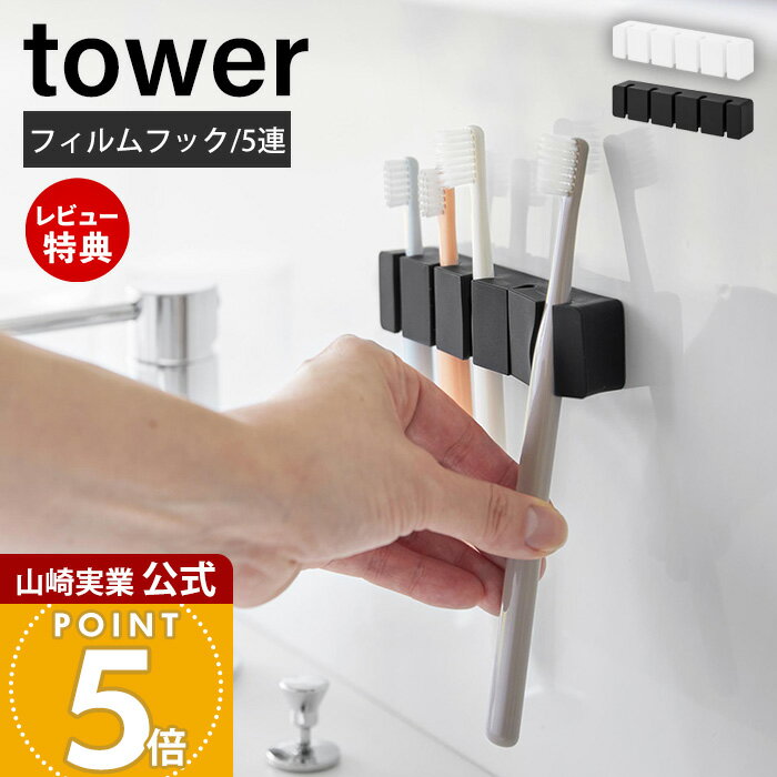 【当店限定特典付き】山崎実業 フィルムフックシリコーン歯ブラシホルダー タワー 5連 tower 公式 歯ブラシスタンド カミソリ 替えブラシ 歯磨き粉 歯ブラシヘッド シリコン 洗面台 ホワイト ブラック 10052 10053