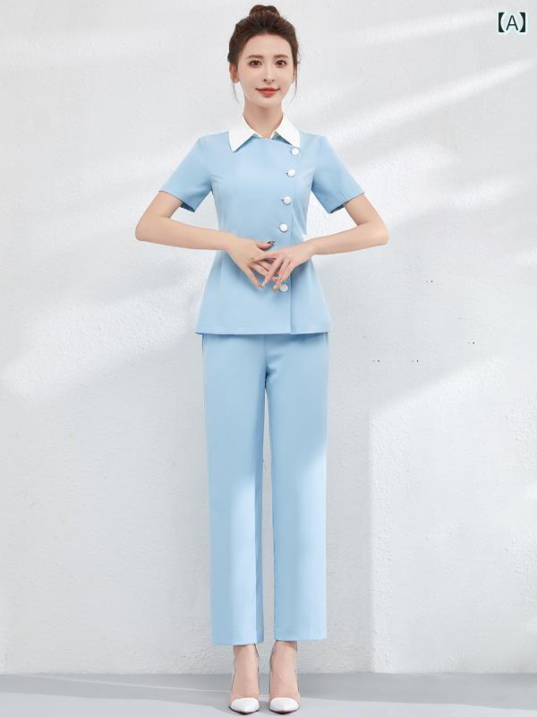 エステ ユニフォーム 半袖 春夏 制服 サロン 技術者 作業服 レディース 白 青 ピンク 無地 ボタン 襟付き 速乾 ストレッチ パンツ 上下セット 大きいサイズ おしゃれ