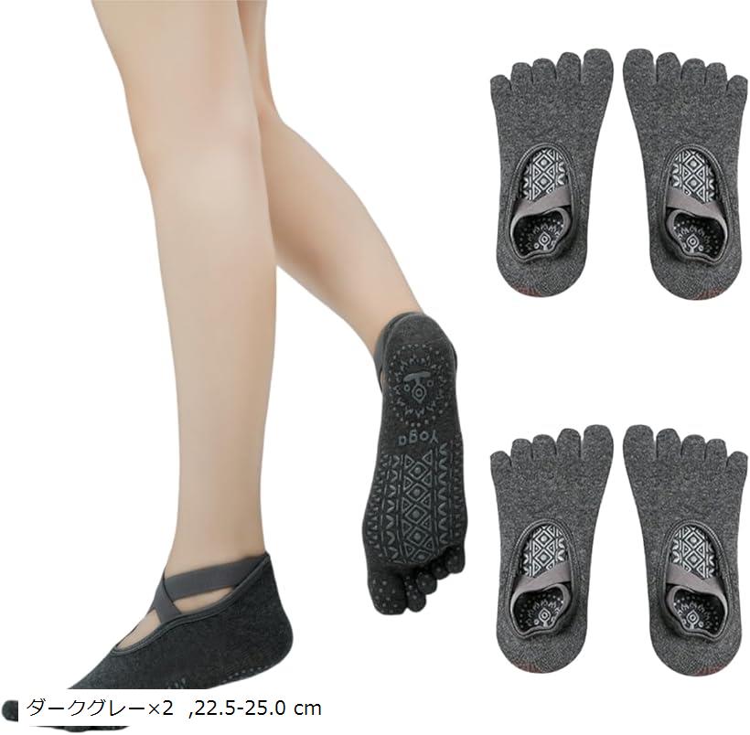 ピラティス 靴下ヨガソックス 5本指 滑り止め レディース 通気性 耐久性 抗菌 防臭 冷房/汗対策 バレエ スポーツ ウェア ダークグレーx2 22.5-25.0 cm