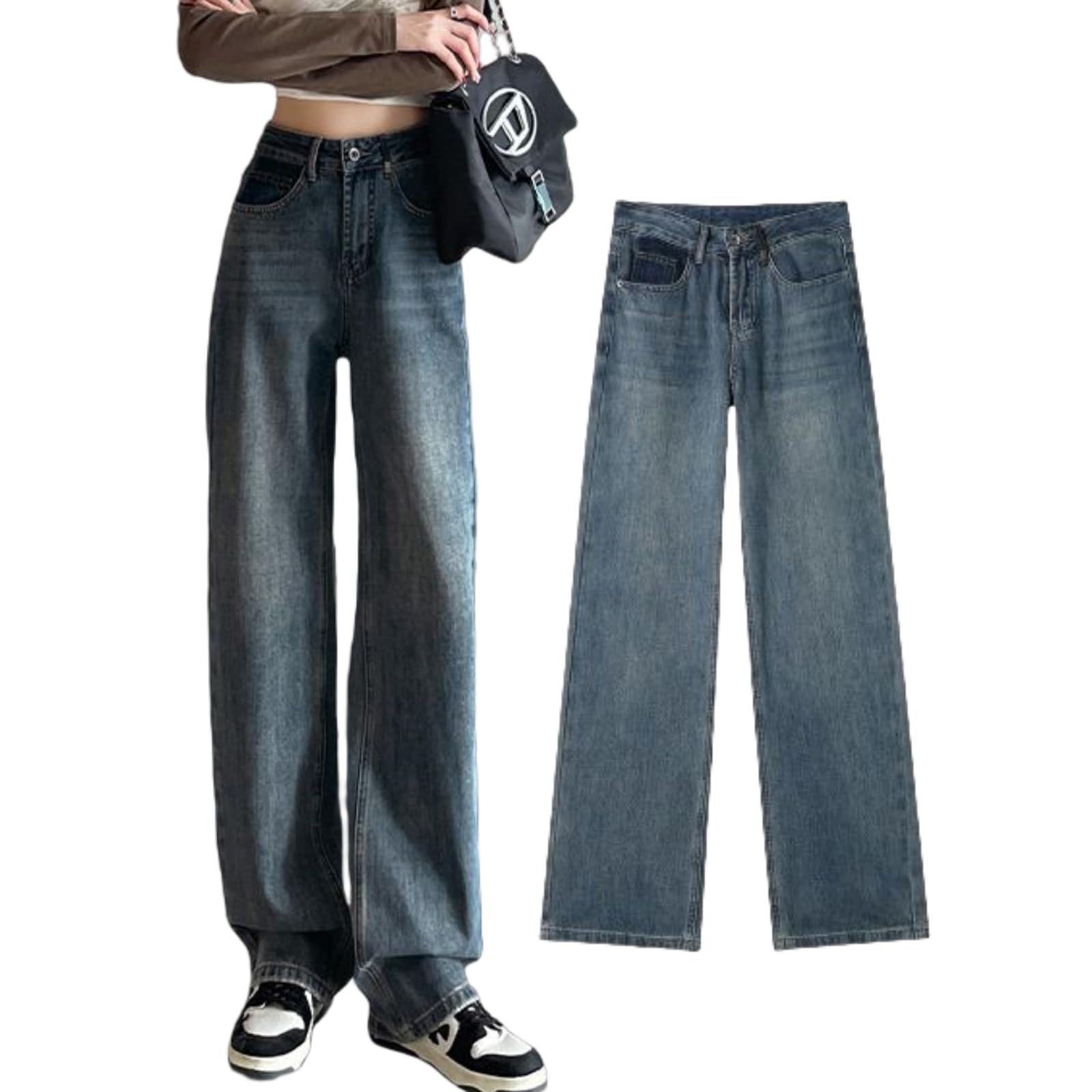 【送料無料】[Narebualo Cietupoop] レディース ジーンズ オーバーサイズ ロングパンツトボトムス 無地 着回し力 ゆったり ハイウエスト 体型カバー 着痩せ ウエストゴム 人気 キャンパススタイル 韓国ファッション かわいい 色:ブルー、サイズ:L