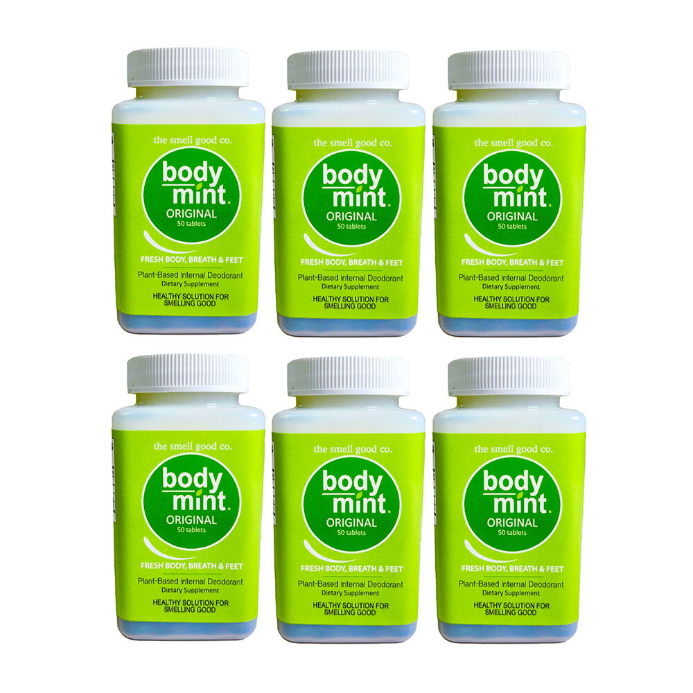 body mintthe smell good co. ORIGINAL Plant-Based Internal Deodorant FRESH BODY, BREATH & FEET HEALTHY SOLUTION FOR SMELLING GOOD 50 tabletsDietary Supplement Body Mint ORIGINALThe ORIGINAL Breath, Body and Foot internal deodorant tablet. Body Mint provides powerful, long-lasting, total body odor protection without the use of harsh chemicals. Made from natural ingredients, Body Mint won't rub off, won't irritate your skin and will keep you feeling confident in any situation. Benefits* fresh breath fresh underarms fresh feet MADE IN THE USA *These statements have not been evaluated by the Food and Drug Administration. This product is not intended to diagnose, treat, cure or prevent any disease. WARNINGS: If you have a medical condition, are on medication, pregnant, nursing or dispensing to a child, seek a doctor's advice before taking. Side effects may include diarrhea or cramps. Reduce dosage or discontinue use if this occurs. Take only as directed. May cause stool to be greenish in color. SUGGESTED USE: As a dietary supplement, 1 tablet in the morning, and 1 tablet in the evening with a glass of water. Other Ingredients: Dicalcium Phosphate, Cellulose and Plant-Based Stearic Acid. Contains NO mint, wheat, gluten, sugar, corn, yeast, dairy or animal products. Serving Size : 1 Tablet serving for container :50 Amount Per Serving % Daily Value Chlorophyllin (SCC) 100 mg * Contains: Sodium 6 mg < 1% Copper 4 mg 444%