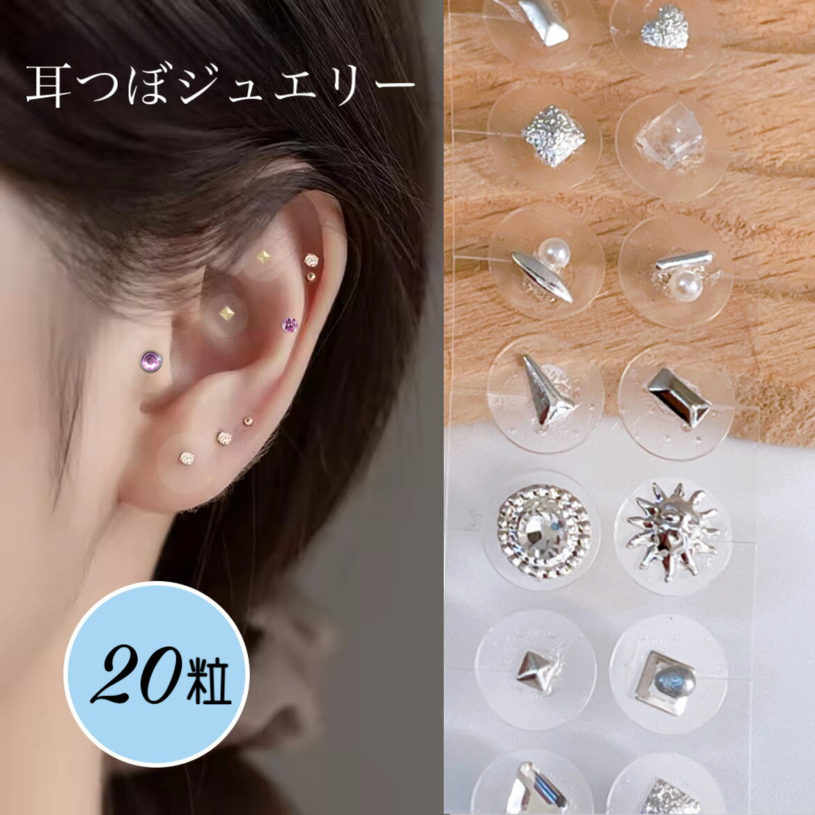 耳つぼジュエリー【20粒】耳ツボジュエリー シール 20枚 シルバー リボン ハート ニュアンス シンプル クリスタル ラインストーン スタッズ サロン使用 セラミック 金アレ対応 アクセサリー 耳ツボダイエット ノンフォールピアス パーツ手作り SABOE