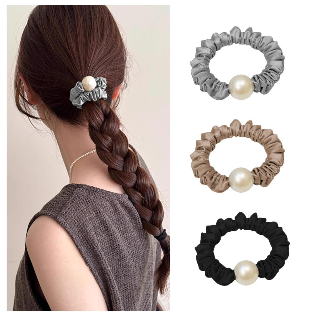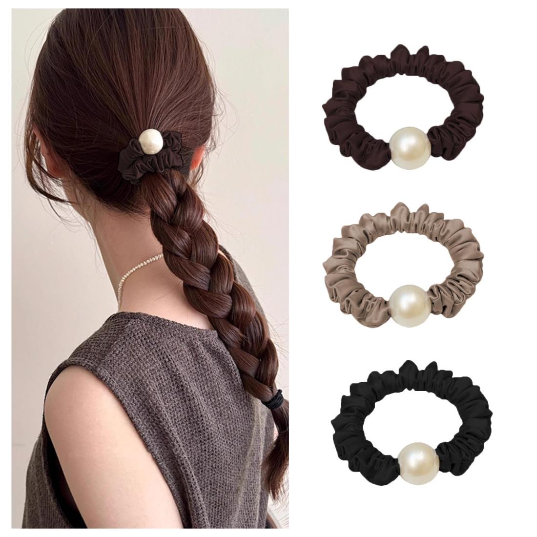 へアゴム パール シュシュ大人 シルク おしゃれ 大人 高弾性 跡がつかない エレガント ヘアアクセサリー 3個セット(ブラック/カーキ/ダークブラウン)【RAINY LEMON】