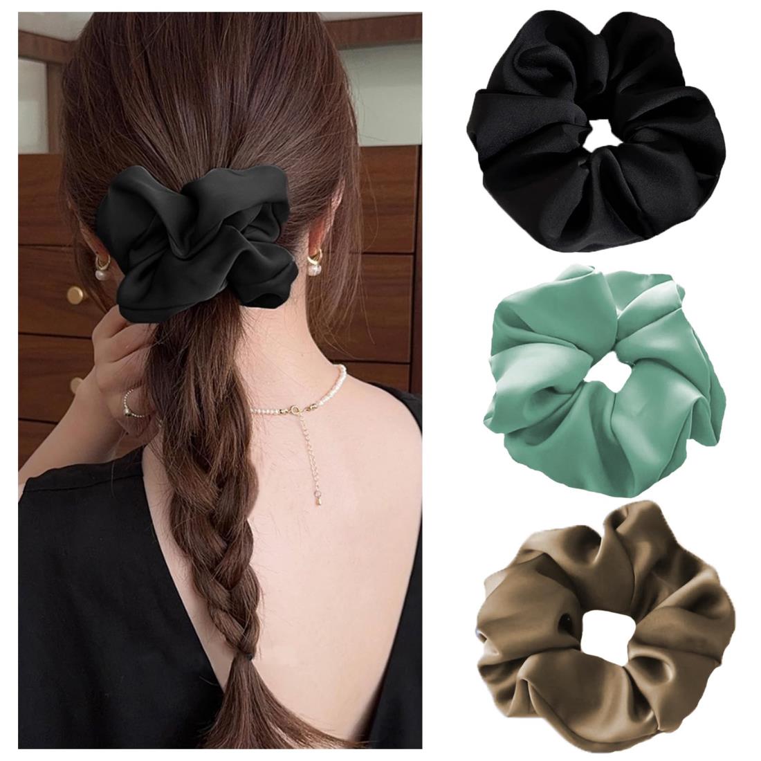 シュシュ 大きめ おしゃれ 大人 ボリューム ヘアゴムサテン 無地 光沢 シンプル 髪飾り レディース エレガント ヘアアクセサリー 髪に優しい 3点セット【RAINY LEMON】 (ブラック/ベージュ/ブルー)