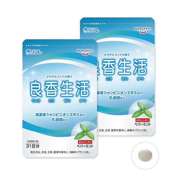 ご注文前に必ず下記をご確認ください ※お支払方法に代金引換・コンビニ後払いはご利用頂けません。 ※お届けはポストへの投函になりますので、配送日時の指定はできません。 製品仕様 内容量(1袋) 27.9g(300mg×93粒) 原材料 シャンピニオンエキス(マッシュルーム、デキストリン) (国内製造)、還元麦芽糖水飴、イソマルトオリゴ糖粉あめ、エリスリトール、有胞子性乳酸菌、澱粉、ガラクトオリゴ糖、難消化性デキストリン、コーヒーエキスパウダー、ゴボウパウダー、ゲッケイジュ葉抽出物、ビフィズス菌乾燥粉末(乳成分を含む)、デキストリン、植物抽出エキス(ゴマを含む)/ショ糖脂肪酸エステル、香料、リンゴ酸、甘味料(ステビア)、微粒酸化ケイ素、環状オリゴ糖、リン酸三カルシウム おすすめの飲み方 1日3粒を目安にお召し上がりください。 JANコード 4560258562034 広告文責 株式会社中広 0584-74-0745 販売元 リフレ株式会社 区分 日本製・健康食品 栄養成分表示(3粒 0.90gあたり) エネルギー たんぱく質 脂質 炭水化物 食塩相当量 3.61kcal 0.01g 0.04g 0.79g 0.001g 【注意事項】 高温・多湿及び直射日光を避けて保存してください。 原材料をご確認の上、食物アレルギーのある方は、お召し上がりにならないでください。 体調に異変を感じた際は、速やかに摂取を中止し、医師に相談してください。 疾病に罹患している場合は医師に、医薬品を服用している場合は医師、薬剤師に相談してください。 開封後はチャックをしっかりと閉めて、賞味期限内にかかわらずなるべく早くお召し上がりください。ペパーミントのいい香り♪気になるニオイをスッキリ爽やかに! 良香生活 ニオイの原因とは? 口臭の原因はなんと言っても口の中に繁殖する細菌。これらは歯磨きなど、普段からのケアが重要です。 他の原因としては胃腸からの臭い。人間の体内はかなりの温度がありますが、これはまさに湿気の多い日本の真夏と同じ状態。つまり、真夏の炎天下に食べ物を置いておくとすぐ腐ってしまうように、人間の体も食べ物の残りカスが腐りやすい状況にあるのです。この腐敗の際に発生する悪臭ガスも、口臭の原因のひとつになるのです。 こうして発生したニオイは自分ではなかなか気付くことができません。そのため、自分では気が付かないうちに、周囲の人に不快感を与えてしまっていることが多いのです。 シャンピニオン&爽やかな香り! そこでおすすめなのがシャンピニオンエキス&ペパーミント。 これはマッシュルームから特殊な製法で抽出された成分で、介護の現場で研究されたのがはじまりです。信頼のある介護の現場発ということから、またたく間に話題を呼び、現在では世界10ヶ国で製法特許を取得しています。 良香生活は、このシャンピニオンエキスをたっぷり配合。そして、口に入れるとペパーミントのさわやかな香り。人との会話もはずむことでしょう。 こだわりの配合成分 良香生活はシャンピニオンエキスだけでなく、その他にもたくさんの成分を贅沢に配合しています。森林浴で一躍有名になったフィトンチットエキスや、植物由来の自然派素材デオアタックといったエチケット成分に加え、腸まで届く有胞子性乳酸菌にビフィズス菌、オリゴ糖を加えた3つの善玉菌、さらに現代の食生活では不足しがちとされる食物繊維、「ローリエ」とも呼ばれ、香辛料として使用される月桂樹エキスと、8成分を贅沢に配合しました。 たくさんの方が実感しています! モニター100名で試験した結果では、92%もの方がペパーミントのさわやかな香りを実感した良香生活。その結果を裏付けるように、発売以来、たくさんの方からお喜びのお声をいただいております。 口臭の悩み、あきらめてしまう前に、良香生活をお役立てください! 良香生活 ラインナップ 単品 2個セット