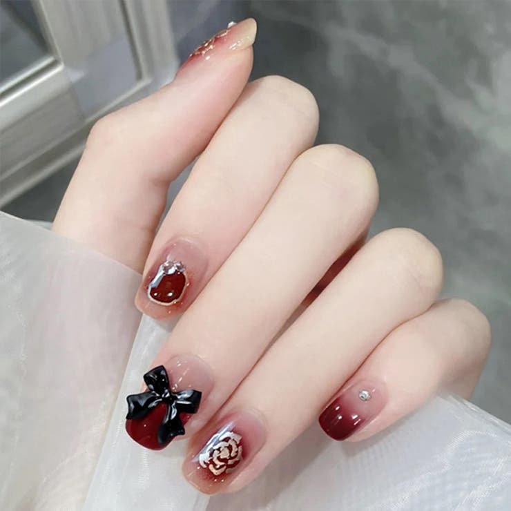 レッド×ゴールドの配色で上品に仕上げたネイルチップ。ツヤ感たっぷりのクリアベースで重たくなりすぎず、指先に馴染むデザインに仕上げました。アクセントにはバラやリボン、ビジューなどのアートをあしらい、ドレッシーな雰囲気に。普段使いにはもちろん、結婚式やパーティーなどのオケージョンコーデにも映えるアイテムとなっています。シールタイプで着脱がしやすく、その日限りのオシャレをお楽しみいただけるのもうれしいところ。お仕事で普段ネイルができない方にもおすすめのセットです。■セット内容・ネイルチップ 24枚・粘着シール 24枚・ネイルファイル 1個(色ランダム)・ウッドスティック 1個(色ランダム) 1個■素材ウレタン樹脂■使用方法消毒用エタノール等で爪の油分や汚れをふき取る粘着グミタイプ:適切なサイズの粘着グミを爪に貼り、表面フィルムを剥がす グルータイプ:ネイルチップの裏側に適量にグルーを塗る爪の根元からネイルチップを付ける20秒ほど押さえてフィットさせる■長持ちの秘訣・ネイルチップを貼る前に、反射点やグリースがなくなるまでネイルファイルで爪を磨きます。・爪よりも少し小さめのネイルチップをお選びください。・粘着グミが温かいと粘着性が高くなります。寒い時期はドライヤーなどで温めてからご使用いただくとより効果的です。・ネイルチップと爪の間の空気を抜くように指でギュッと押さえると、さらにしっかりと密着します。・効果を長持ちさせるため、粘着後2時間は水に触れないようにしてください。■外し方ウッドスティックを自爪とチップの間に少しずつ差し込み、ゆっくりと剥がしてください。無理やり剥がすと爪が痛む原因となります。※剥がしにくい場合は、外す前に指をぬるま湯に5?10分程浸すか、ウッドスティックにオイルなどを含ませてから行うと効果的です。■原産国MADE IN CHINA■注意事項・撮影画像と実物の色合いが多少異なって見える場合がございます。・サイズは平置きでの採寸となりますので、測定方法によって多少の誤差が生じる場合がございます。・入荷・生産時期により、色味、サイズ、素材などが多少異なる場合がございます。・本製品は生産過程におきまして、生地を織る際の糸の継ぎ目や多少のほつれが生じることがあります。・お手頃な価格でご提供しているため、簡易包装となっており、保管・梱包時にシワが生じる場合がございます。・靴商品については、商品箱が破損している場合がございます。上記内容について、あらかじめご了承くださいますようお願い申し上げます。返品・交換について購入後の交換は受け付けておりません。予めご了承ください。返品を希望される場合は購入履歴一覧の「ショップへの問い合わせ」よりお問い合わせください。=========================複数配送先指定について1件の注文に対して、異なる住所への配送は対応出来かねます。恐れ入りますが、異なる住所へ配送をご希望の場合、配送先毎に分けて注文いただきますようお願い申し上げます。【ネイル・マニキュアWOMEN】ワインレッド F
