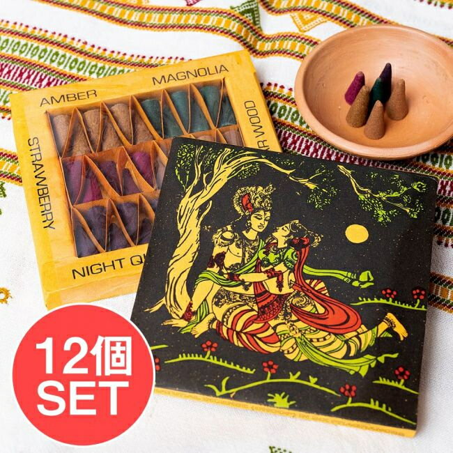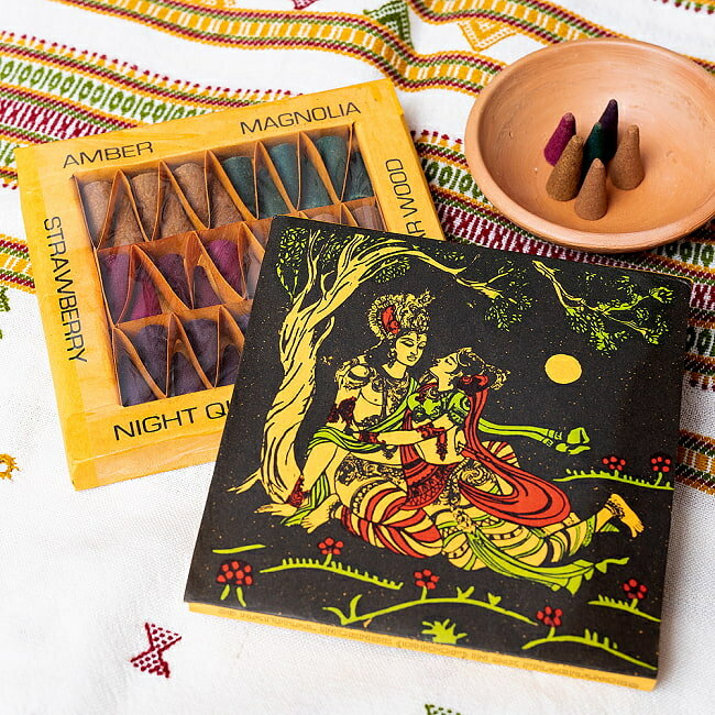 ■シヴァ神とクリシュナのお香 Bam Bam Bhole香&NAMASTE香〔2箱セット〕ナチュラルインセンス コーン香セットの詳細 ■セット内容■ シヴァへの祈りを込めたお香 Bam Bam Bhole 〔6種の香り 36個入り〕 ナチュラルインセンス コーン香セット x 1個 深い愛の象徴 クリシュナ お香 NAMASTE 〔6種の香り 36個入り〕 ナチュラルインセンス コーン香セット x 1個 シヴァへの祈りを込めたお香 Bam Bam Bhole 〔6種の香り 36個入り〕 ナチュラルインセンス コーン香セットのデータ 【内容量】 36個入り 【備考】 写真の皿は付属いたしません。柔らかい紙のケースなので、部分的な凹み等ある場合がございます。また、手作りのお香の為、若干部分的な欠け等ある場合がございます。予めご了承くださいませ。 深い愛の象徴 クリシュナ お香 NAMASTE 〔6種の香り 36個入り〕 ナチュラルインセンス コーン香セットのデータ 【内容量】 36個入り 【備考】 写真の皿は付属いたしません。柔らかい紙のケースなので、部分的な凹み等ある場合がございます。また、手作りのお香の為、若干部分的な欠け等ある場合がございます。予めご了承くださいませ。商品サイズ約1.40cm x 11.50cm x 11.50cm 約60g大ロットでのご購入について飲食店様、雑貨店様など、業務用の数の多いご注文も大歓迎です。在庫がある分は即納できます。配送についてあす楽について■伝統的手法で作られています こちらのBAM BAM BHOLE香は、インドの伝統的な製法で作られたお香です。 サンダルウッド、樹脂、ハーブ、天然の花から抽出した香り豊かな芳香油を加え、 手作りのウッドブロックでコーンの形を型取り、ハンドメイドされております。 ■■6種の香りが楽しめます こちらは、アンバー、マグノリア、ストロベリー、 シダーウッド、ナイトクイーン、ムスクと6種類の香りが楽しめます。 それぞれ6個ずつ入っているので、合計で36個入り! 複数の香りが入っているので、一箱で沢山の香りを楽しむことができるお香セットです。 ■シヴァへの祈りの言葉 お香の名前になっている、BAM BAM BHOLE(Bham Bham Bhole)は、 「親愛なるシヴァ神よ、どうか私の恐怖を追い払って下さい」という、 シヴァ神への祈りを込めた言葉です。 ■コーン香タイプです 火をつけてみたところです。 コーン香は円錐型で、燃える面積が徐々に増えていくので、 香りを早く、部屋中に届けることができます。 お香立てや、陶器の上などでお楽しみいただけます。 ■セット商品となります こちらの商品は、Bam Bam Bhole香1箱と、NAMASTE香1箱の2箱セットです。単品でご購入いただくよりも、お得なお値段になっています。 ■伝統的手法で作られています こちらのBAM BAM BHOLEとNAMASTE香は、インドの伝統的な製法で作られたお香です。サンダルウッド、樹脂、ハーブ、天然の花から抽出した香り豊かな芳香油を加え、手作りのウッドブロックでコーンの形を型取り、ハンドメイドされております。 ■Bam Bam Bhole 6種の香り内容 こちらは、アンバー、マグノリア、ストロベリー、シダーウッド、ナイトクイーン、ムスクと6種類の香りが楽しめます。 ■NAMASTE香 6種の香り内容 こちらは、ポピー、ジャスミン、パチュリ、ロードデンドロン(シャクナゲ)、サンダルウッド、ローズと6種類の香りが楽しめます。それぞれ6個ずつ入っているので、合計で36個入り!複数の香りが入っているので、一つで沢山の香りを楽しむことができるお香セットです。 ■シヴァ神への祈りの言葉 お香の名前になっている、BAM BAM BHOLE(Bham Bham Bhole)は、「親愛なるシヴァ神よ、どうか私の恐怖を追い払って下さい」という、シヴァ神への祈りを込めた言葉。 「Bham」はサンスクリット語で怒りや恐怖を表し、「Bhole」は無邪気さ、喜ぶ人を指します。「Bhole」は「Bholenath」というシヴァ神の名の一つからきています。シヴァ神は、複雑な儀式をしなくても、簡単に喜び、祝福を与えてくれる神様として、敬愛されています。 ■英雄クリシュナ ヒンドゥー教の最高神であるヴィシュヌの7番目の化身といわれるクリシュナ。ビシュヌの化身の起源ともいわれ、強くて男前な、いわゆるプレイボーイの神様です。そんなクリシュナと恋人の娘、牛飼いのラーダと並んだパッケージ。ヴィシュヌの化身のクリシュナに対し、ラーダはラクシュミーの化身とされています。「ギータ・ゴーヴィンダ」という二人を描いた叙事詩もあり、男女愛の象徴とされている二人です。