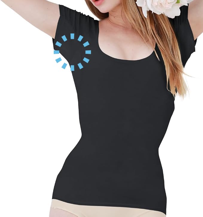 【送料無料】[魔法のタイツ] ストレス0の汗対策 汗染み防止 脇汗インナー最強 レディース 【特大パッド 広範囲カバー 吸湿速乾 消臭加工 高伸縮】 汗わきパッド付きインナー 滝汗 汗取りインナー 深あき 脇隠しインナー 透けにくい Tシャツ 型 色:ブラック、サイズ:L