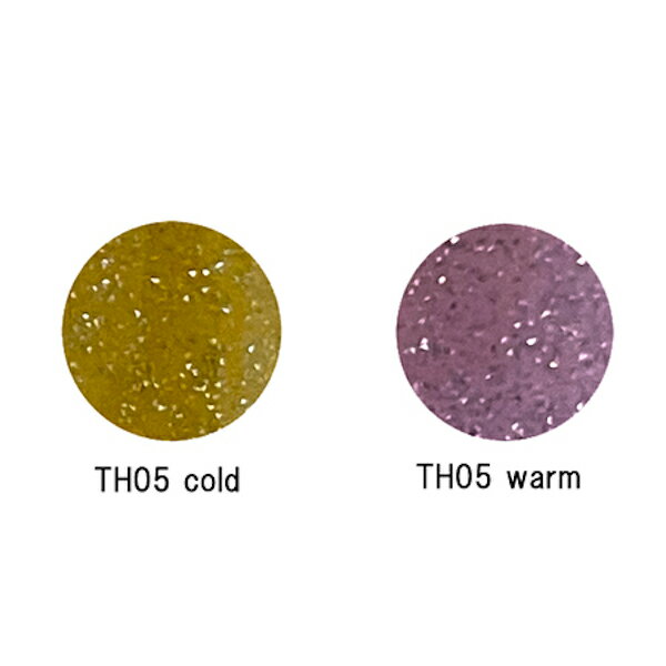 【必ずベースジェルを一層塗布した上からご使用ください】 貴方色に変わるジェル 気温や体温によって色が変化する特殊なジェルです。 つけた瞬間から貴方のシーンを指先のカラーに映し続けます。 しかも暗闇で光を当てればフラッシュに! 見るたび違う表情のオンリーワンネイルを愉しんで。 cold:30℃以下 warm:31℃以上 cold:イエロー warm:パープル 品番:TH05 内容量:3g 硬化時間:UV約2分 / LED約30秒 備考;ソフトジェル、パール、グリッター&ラメ、ソークオフタイプ