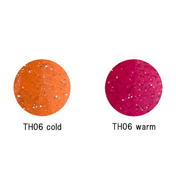 【必ずベースジェルを一層塗布した上からご使用ください】 貴方色に変わるジェル 気温や体温によって色が変化する特殊なジェルです。 つけた瞬間から貴方のシーンを指先のカラーに映し続けます。 しかも暗闇で光を当てればフラッシュに! 見るたび違う表情のオンリーワンネイルを愉しんで。 cold:30℃以下 warm:31℃以上 cold:オレンジ warm:ピンク 品番:TH06 内容量:3g 硬化時間:UV約2分 / LED約30秒 備考;ソフトジェル、パール、グリッター&ラメ、ソークオフタイプ