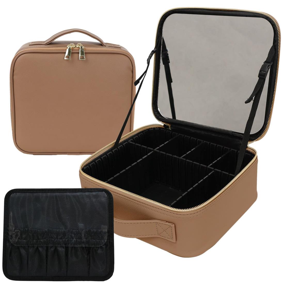 MRG 鏡付きメイクボックス オリジナルカラー 大容量 メイクボックス メイクポーチ コスメボックス 持ち運び 鏡付き プロ用 自立式 仕切り調整可能 メイク収納 卓上 コンパクト 化粧ポーチ 手持ち バッグ 収納ボックス コスメ収納 オープン 大きめ 横長 黒 茶色 メイク 道具