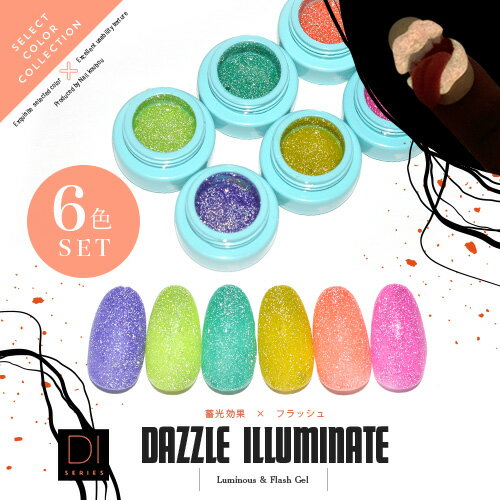 【全6色セット】カラージェル 蓄光&フラッシュグリッターの『DAZZLE ILLUMINATE』DIシリーズ ジェルネイル セレクトカラージェル | カラー ポリッシュ ネイルジェル アートジェル ジェルネイル用品 爪 カラージェルネイル ジェルネイルアート ネイル工房 にわちゃん