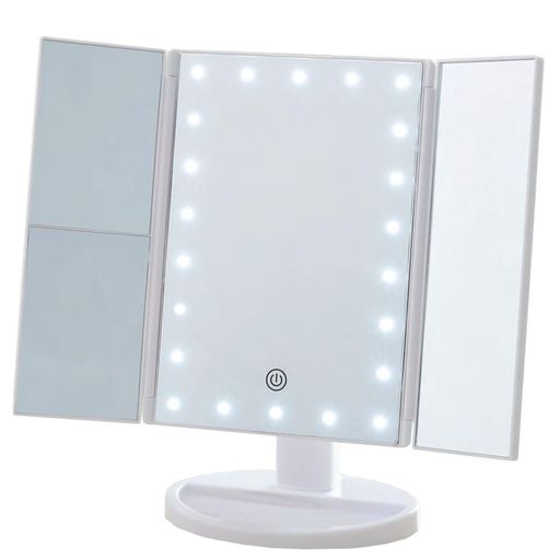 【サイズ】約幅34x奥行12.5x高さ27.3cm 【特長】2倍・3倍の拡大鏡付きタッチセンサー長押しで調光が可能ミラーは角度調整ができ、お好みに合わせて、さまざまなアングルで使用できます電池対応(※1)・USBケーブル付属(※1)単3形x4本※別売り 材質:ミラー:ガラス本体・台座:ABS樹脂重量:690g梱包内容:本体/台座、USBケーブル、取扱説明書・保証書 サイズ(約):幅340x奥行125x高さ290(mm)※鏡面使用時幅180x奥行125x高さ290(mm)※折り畳み時材質:ミラー:ガラス本体・台座:ABS樹脂重量:690g梱包内容:本体/台座、USBケーブル、取扱説明書・保証書