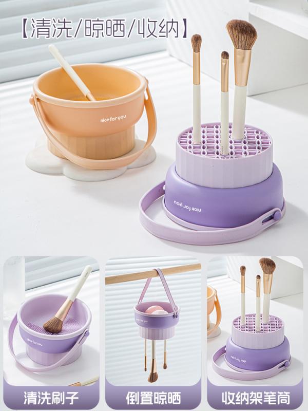 メイクブラシ 洗浄バケツ 乾燥一体型 美容スポンジ パフ クリーニングブラシ ボウル 立てかけ 収納ボックス ピンク パープル スキンカラー