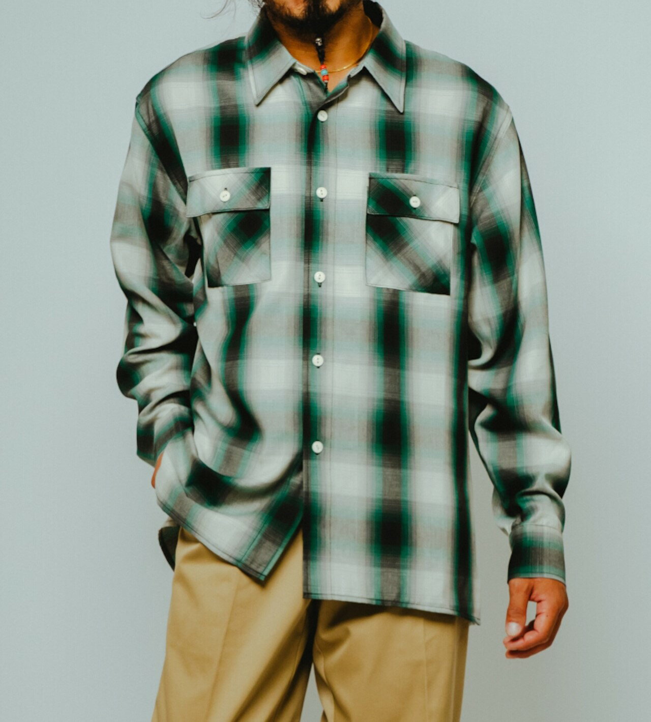 (BIG MIKE/ビッグマイク) Rayon Mix Ombre Slit L/S Shirts / WHT×GRN×BLK (メンズ)M/L/XLサイズ