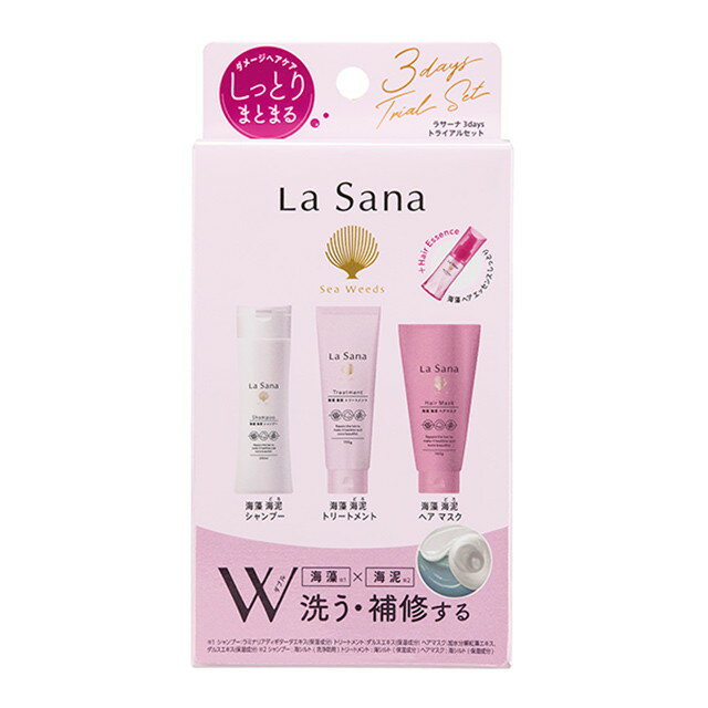 ◆商品のご案内 商品名(製品名)ラサーナ ダメージ 3デイズトライアルセット 内容量SP3包、TR2包、ヘアマスク1包、エッセンス3包 商品説明(製品の特徴)『シャンプー、トリートメント、ヘアマスク、ヘアエッセンス』のお試しセットワンコインで髪のトータルケアができるパウチセットになります。 使用上の注意【3品共通】傷、しっしん等肌に以上がある時は使用しないでください。目に入った時は、すぐに水で洗い流してください。異常が出たら、使用を中止し、皮膚科専門医等へのご相談をおすすめします。持ち運びの際は、液漏れにご注意ください。乳幼児の手の届く場所、高温、直射日光をさけて保管してください。【海藻海泥シャンプー】海泥などの成分が分離することがありますが、品質上問題ありません。よく振ってお使いください。【海藻ヘアエッセンス】お肌に異常が生じていないかよく注意して使用してください。ファンヒーターの故障の原因になることがあるため、同じ部屋で使用しないでください。 成分・分量(ヘアエッセンス)シクロメチコン、ジメチコン、イソステアリン酸ヘキシルデシル、スクワラン、ラミナリアオクロロイカエキス、褐藻エキス、オリーブ油、ローヤルゼリーエキス、トコフェロール、コメ胚芽油、トリ(カプリル酸/カプリン酸)グリセリル(シャンプー)水、ラウロイルメチル‐β‐アラニンタウリンTEA、コカミドプロピルベタイン、ココイルグリシンK、オレフィン(C14‐16)スルホン酸Na、コカミドメチルMEA、ココイルグルタミン酸TEA、ラミナリアディギタータエキス、ジヒドロキシプロピルアルギニンHCI、水溶性コラーゲン、オリーブ果実油、シロキクラゲ多糖体、海シルト、カオリン、サピンヅストリホリアツス果実エキス、ホホバ種子油、スクワラン、カニナバラ果実油、カラメル、クチナシ青、ポリクオタニウム‐7、グアーヒドロキシプロピルトリモニウムクロリド、ムラサキ根エキス、センブリエキス、PCA‐Na、乳酸Na、アルギニン、アスパラギン酸、PCA、グリシン、アラニン、セリン、バリンプロリン、トレオニン、イソロイシン、ヒスチジン、フェニルアラニン、サンショウ果実エキス、BG、エタノール、セテアレス‐60ミリスチルグリコール、ジステアリン酸PEG‐150、ジステアリン酸グリコール、フェノキシエタノール、ジメチコン、ジメチコノール、PEG‐200水添ヒマシ油、メチルパラベン、プロピルパラベン、エチルパラベン、安息香酸Na、クエン酸、クエン酸Na、香料(トリートメント)水、セテアリルアルコール、グリセリン、ベヘナミドプロピルジメチルアミン、ジメチコン、BG、ダルスエキス、ハマナ葉エキス、海シルト、カオリン、ステアルジモニウムヒドロキシプロピル加水分解ケラチン(羊毛)、ジヒドロキシプロピルアルギニンHCI、ココイルアルギニンエチルPCA、ポリクオタニウム‐61、水溶性コラーゲン、オリーブ果実油、スクワラン、ホホバ種子油、野菜油、カニナバラ果実油、加水分解ケラチン(羊毛)、(ジヒドロキシメチルシリルプロポキシ)ヒドロキシプロピル加水分解ケラチン(羊毛)、キトサンサクシナミド、PCA、PCA‐Na、アルギニン、アスパラギン酸、ジラウロイルグルタミン酸リシンNa、グリシン、アラニン、セリン、バリン、プロリン、トレオニン、イソロイシン、ヒスチジン、フェニルアラニン、乳酸Na、乳酸、エタノール、ダイマージリノール酸ジ(イソステアリル/フィトステリル)、グリコシルトレハロース、トリイソステアリン酸トリメチロールプロパン、ダイマージリノール酸(フィトステリル/イソステアリル/セチル/ステアリル/ベヘニル)、イソステアリルアルコール、イソステアリン酸ヘキシルデシル、加水分解水添デンプン、クエン酸、クエン酸Na、ヒドロキシエチルセルロース、アミノプロピルジメチコン、アモジメチコン、カラメル、クチナシ青、銅クロロフィリンNa、PEG‐200水添ヒマシ油、フェノキシエタノール、メチルパラベン、プロピルパラベン、香料(ヘアマスク)水、セテアリルアルコール、グリセリン、ジメチコン、ベヘナミドプロピルジメチルアミン、ビスジグリセリルポリアシルアジペート‐2、ダイマージリノール酸ジ(イソステアリル/フィトステリル)、エタノール、アモジメチコン、加水分解紅藻エキス、ダルスエキス、アルギン酸Na、加水分解ケラチン(羊毛)、ココジモニウムヒドロキシプロピル加水分解シルク、メドウフォーム‐δ‐ラクトン、(ジヒドロキシメチルシリルプロポキシ) ヒドロキシプロピル加水分解ケラチン(羊毛)、ハマナ葉エキス、キトサンサクシナミド、水溶性コラーゲン、オリーブ果実油、カニナバラ果実油、ホホバ種子油、スクワラン、ジヒドロキシプロピルアルギニンHCI、海シルト、カオリン、トコフェロール、ポリクオタニウム‐61、ネオペンタン酸イソステアリル、トリ(カプリル酸/カプリン酸/ミリスチン酸/ステアリン酸)グリセリル、ステアリルアルコール、オレイルアルコール、クエン酸、