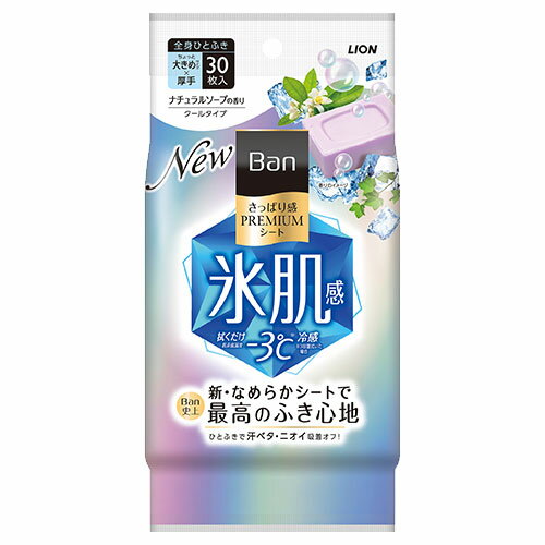 ※画像はイメージです。パッケージデザイン等は予告なしに変更されることがあります。※メーカーの欠品や製造中止により納期遅延、またはお届けできない場合がございます。ライオン Ban さっぱり感PREMIUMシート クールタイプ ナチュラルソープの香り Ban 30枚 発売日:2022年2月16日●ついに実現!Ban史上最高のふき心地ふき始めから気持ち良い、極上のふく心地によるさっぱり感。サイズは従来品に対して約1.3倍、シートの液量は約1.7倍!たっぷり液を含んで乾かずふける!●クールタイプシートにたっぷり含まれた冷却ウォーター※1により、ふくだけで-3℃の冷感※2。クール感が長続き!●新・なめらかシート採用メイク落としシートにも使用される高いふき取り性を有するマイクロ繊維により、肌当たりがやさしく、身体のさまざまな部位にもしっかりフィットして汗のべたつき・皮脂・ニオイをふき取ってくれます。●しっかりふける厚みと大きさのシート。シートが乾きにくいので全身をさっぱりふける当社従来品に比べて、厚みが約1.5倍、大きさが約1.3倍なので、1枚で全身をしっかりふけます。また、シートに含浸される液量が当社従来品に比べて約1.7倍に増えました。液をたっぷり含んでいるのでシートが乾きにくく、シート1枚で全身がさっぱりします。●香水をモチーフにした上品な香り●クールタイプシートにたっぷり含まれた冷却ウォーター※1により、拭くだけで-3℃の冷感※2清涼成分が含まれる冷却ウォーターでふいた後、長時間ひんやりクール感が持続します。 ※1 清涼剤、水※2 前腕内側部を3往復ふいた直後とふく前の皮膚表面温度の比較(当社調べ) 【仕様】容量:30枚
