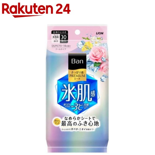 ※画像はイメージです。パッケージデザイン等は予告なしに変更されることがあります。※メーカーの欠品や製造中止により納期遅延、またはお届けできない場合がございます。ライオン Ban さっぱり感PREMIUMシート クールタイプ ひんやりシトラスの香り Ban 30枚 発売日:2022年2月16日●ついに実現!Ban史上最高のふき心地ふき始めから気持ち良い、極上のふく心地によるさっぱり感。サイズは従来品に対して約1.3倍、シートの液量は約1.7倍!たっぷり液を含んで乾かずふける!●クールタイプシートにたっぷり含まれた冷却ウォーター※1により、ふくだけで-3℃の冷感※2。クール感が長続き!●新・なめらかシート採用メイク落としシートにも使用される高いふき取り性を有するマイクロ繊維により、肌当たりがやさしく、身体のさまざまな部位にもしっかりフィットして汗のべたつき・皮脂・ニオイをふき取ってくれます。●しっかりふける厚みと大きさのシート。シートが乾きにくいので全身をさっぱりふける当社従来品に比べて、厚みが約1.5倍、大きさが約1.3倍なので、1枚で全身をしっかりふけます。また、シートに含浸される液量が当社従来品に比べて約1.7倍に増えました。液をたっぷり含んでいるのでシートが乾きにくく、シート1枚で全身がさっぱりします。●香水をモチーフにした上品な香り●クールタイプシートにたっぷり含まれた冷却ウォーター※1により、拭くだけで-3℃の冷感※2清涼成分が含まれる冷却ウォーターでふいた後、長時間ひんやりクール感が持続します。 ※1 清涼剤、水※2 前腕内側部を3往復ふいた直後とふく前の皮膚表面温度の比較(当社調べ) 【仕様】容量:30枚