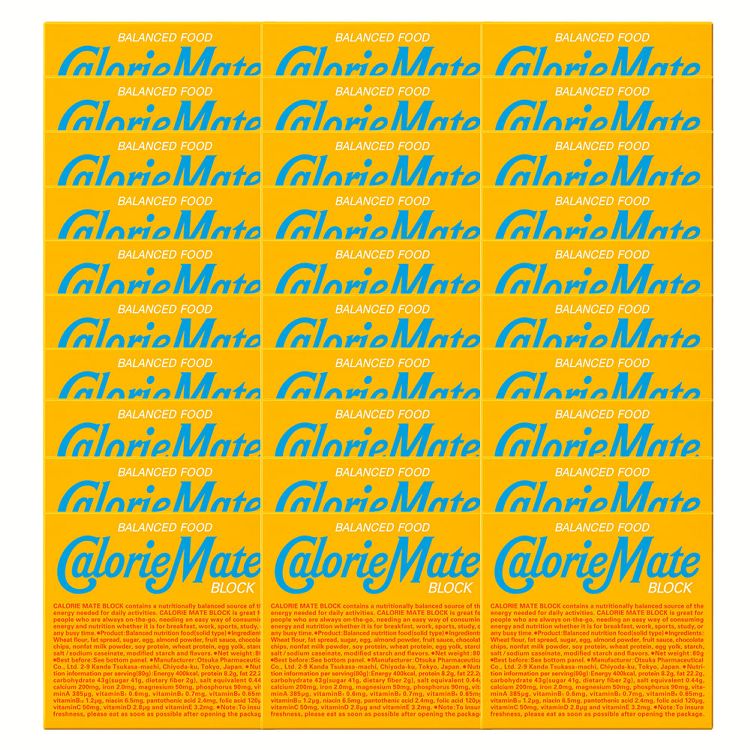 【商品特徴】 ●身体に必要な11種類のビタミン・6種類のミネラル・タンパク質・脂質がバランスよく含まれています。 ●ビタミンは1日に必要な量の約半分が含まれています。 ●おいしく、腹もちのいいショートブレッドタイプ。携帯や保存にも便利です。 ●ブロック1本が100kcal。カロリー計算も簡単です。 内容量 1箱4本 原材料 小麦粉(国内製造)、マーガリン(乳成分を含む)、砂糖、ナチュラルチーズ、卵、アーモンドパウダー、でん粉、脱脂粉乳、大豆タンパク、小麦タンパク、食塩/カゼインナトリウム、加工でん粉、香料、カロチノイド色素 栄養成分 4本(80g)あたり エネルギー/400kcal たんぱく質/8.4g 脂質/22.2g 糖質/40.7g 食物繊維/2g ナトリウム/370mg カリウム/100mg カルシウム/200mg 鉄/2.5mg マグネシウム/50mg リン/100mg ビタミンA/225μg ビタミンB1/0.5mg ビタミンB2/0.6mg ビタミンB6/0.5mg ビタミンB12/1μg ナイアシン/5.5mg パントテン酸/2.8mg 葉酸/100μg ビタミンC/40mg ビタミンD/2.5μg ビタミンE/4mg メーカー 大塚製薬TEL/0120-550-708 受付時間 9:00~17:00(土・日・祝日を除く) JAN:4987035090113カラダに必要な栄養素を、いつでもどこでも手軽に補給。 11種類のビタミン+6種類のミネラル!! 便利な固形タイプのカロリーメイト★ 忙しい現代人の食生活をバックアップする、バランス栄養食。 災害時(パンデミック対策)の備蓄としても大人気です! ◆◇◆カロリーメイトシリーズはコチラ◆◇◆
