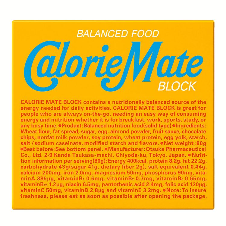 ※リニューアルに伴いパッケージ・内容等予告なく変更する場合がございます。予めご了承ください。身体に必要な5大栄養素が手軽に摂れるバランス栄養食。【製品特長】・身体に必要な11種類のビタミン、5種類のミネラル、タンパク質、脂質、糖質を手軽に補給できるバランス栄養食です。・1本100kcalで4本入りです。・ビタミンは1日に必要な量の約半分が含まれています。(*1日に必要な量は「2015年栄養素等表示基準値」をもとにしています)・世代を問わず人気の高いバニラ味に、チョコレートチップのアクセント。●内容量4本入り●原材料小麦粉(国内製造)、ファットスプレッド(乳成分を含む)、砂糖、卵、アーモンドパウダー、フルーツソース(りんごを含む)、チョコレートチップ、脱脂粉乳、大豆タンパク、小麦タンパク、卵黄、でん粉、食塩/カゼインナトリウム、加工でん粉、香料●栄養成分表示4本(80g)当たりエネルギー:400kcal、タンパク質:8.2g、脂質:22.2g、炭水化物:43g(糖質:41g、食物繊維:2g)、食塩相当量:0.44g、カルシウム:200mg、鉄:2.0mg、マグネシウム:50mg、リン:90mg、ビタミンA:385μg、ビタミンB1:0.6mg、ビタミンB2:0.7mg、ビタミンB6:0.65mg、ビタミンB12:1.2μg、ナイアシン:6.5mg、パントテン酸:2.4mg、葉酸:120μg、ビタミンC:50mg、ビタミンD:2.8μg、ビタミンE:3.2mg●原産国日本○広告文責:e-net shop株式会社(03-6706-4521)○メーカー(製造):大塚製薬株式会社○区分:健康食品(検索用:カロリーメイト バランス栄養食 5大栄養素 栄養補助食品 バニラ 防災 受験 朝食 食事 4987035648918) 最強翌日配送対象商品に関するご案内 最強翌日配送対象商品・対象地域に該当する場合は最強翌日配送マークがご注文カゴ近くに表示されます。 最強翌日配送可能なお支払方法は【クレジットカード、代金引換、全額ポイント支払い】のみとなります。 下記の場合は最強翌日配送対象外となります。 ・15点以上ご購入いただいた場合 ・時間指定がある場合 ・ご注文時備考欄にご記入がある場合 ・決済処理にお時間を頂戴する場合 ・郵便番号や住所に誤りがある場合 ・最強翌日配送対象外の商品とご一緒にご注文いただいた場合 ・お届け先住所文字数が40文字以上の場合