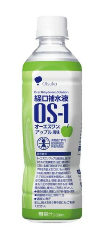 <経口補水液> OS-1(オーエスワン) アップル風味 ◆OS-1の特長 ●オーエスワンは、電解質と糖質の配合バランスを考慮した経口補水液です。 ●軽度から中等度の脱水状態の方の水・電解質を補給するのに適した病者用食品です。 ●感染性腸炎、感冒による下痢・嘔吐・発熱を伴う脱水状態、高齢者の経口摂取不足による脱水状態、過度の発汗による脱水状態等に適しています。 ◆OS-1の成分表示 100mLあたり エネルギー:10kcal 、タンパク質:0g、脂質:0g、炭水化物:2.5g、食塩相当量 0.292g(ナトリウム115mg) 、カリウム:78mg、マグネシウム:2.4mg、リン:6.2mg、ブドウ糖:1.8g、塩素:177mg ◆OS-1の配合成分ブドウ糖(国内製造)、果糖、食塩<br><br> 添加物・・・クエン酸(Na)、塩化カリウム、リン酸ナトリウム、塩化マグネシウム、香料、甘味料(スクラロース) ◆OS-1のお召し上がり方 下記の1日当たり目安量を参考に、脱水症状に合わせて適宜増減してお飲みください。 学童~成人(高齢者含む)・500mL~1000mL/日 幼児・・・300mL~600mL/日 乳児・・・体重1kg当たり30~50mL/日 ◆OS-1の取り扱い上の注意 ※医師から脱水症の食事療法として指示された場合にお飲みください。医師、薬剤師、看護師、管理栄養士、登録販売者の指導に従ってお飲みください。 ・食事療法の素材として適するものであって、多く飲用することによって原疾患が治癒するものではありません。 ・凍らせないで下さい。内用液が膨張し、容器が破損する場合があります。 ・開栓後はすぐにお飲み下さい。中身が残った状態で常温で放置すると、容器が破損したり、キャップが飛ぶおそれがあります。 商品名 OS-1(オーエスワン)アップル風味 名 称 経口補水液 内容量 500mL 保存方法 直射日光を避け、湿気の少ない涼しい所に保存してください。 使用期限 パッケージに記載 広告文責 有限会社 横川ヤマト TEL 082-295-1732 メーカー 大塚製薬 製造・区分 日本・経口補水液 JAN:コード 4987035652212 <購入時の注意事項> ・予告無くパッケージが変更にある場合がありますので予めご了承下さい。 ・製造・取扱い中止の場合にはキャンセル処理をさせて頂く場合がございます。 ・お客様のご都合によるご注文内容の変更・キャンセル・返品・交換はお受けできません。【医薬品】 あなたのお悩みを症状で探す更年期でお悩みの方アレルギー性鼻炎の方残尿感でお困りの方お休み時の激しいせきにアレルギー体質の方痔でお悩みの方胃腸障害でお悩みの方頭痛めまいでお悩みの方疲れやすい方に蓄膿症でお困りの方乳腺炎でお悩みの方不眠症でお悩みの方血圧が高めの方頑固な便秘でお困りの方神経痛・関節痛に排尿痛でお困りの方ストレスでお悩みの方むくみでお悩みの方月経不順の方眼精疾患でお悩みの方肝臓疾患でお悩みの方中耳炎でお困りの方歯槽膿漏でお悩みの方腎臓疾患でお悩みの方手足のしびれお悩みの方