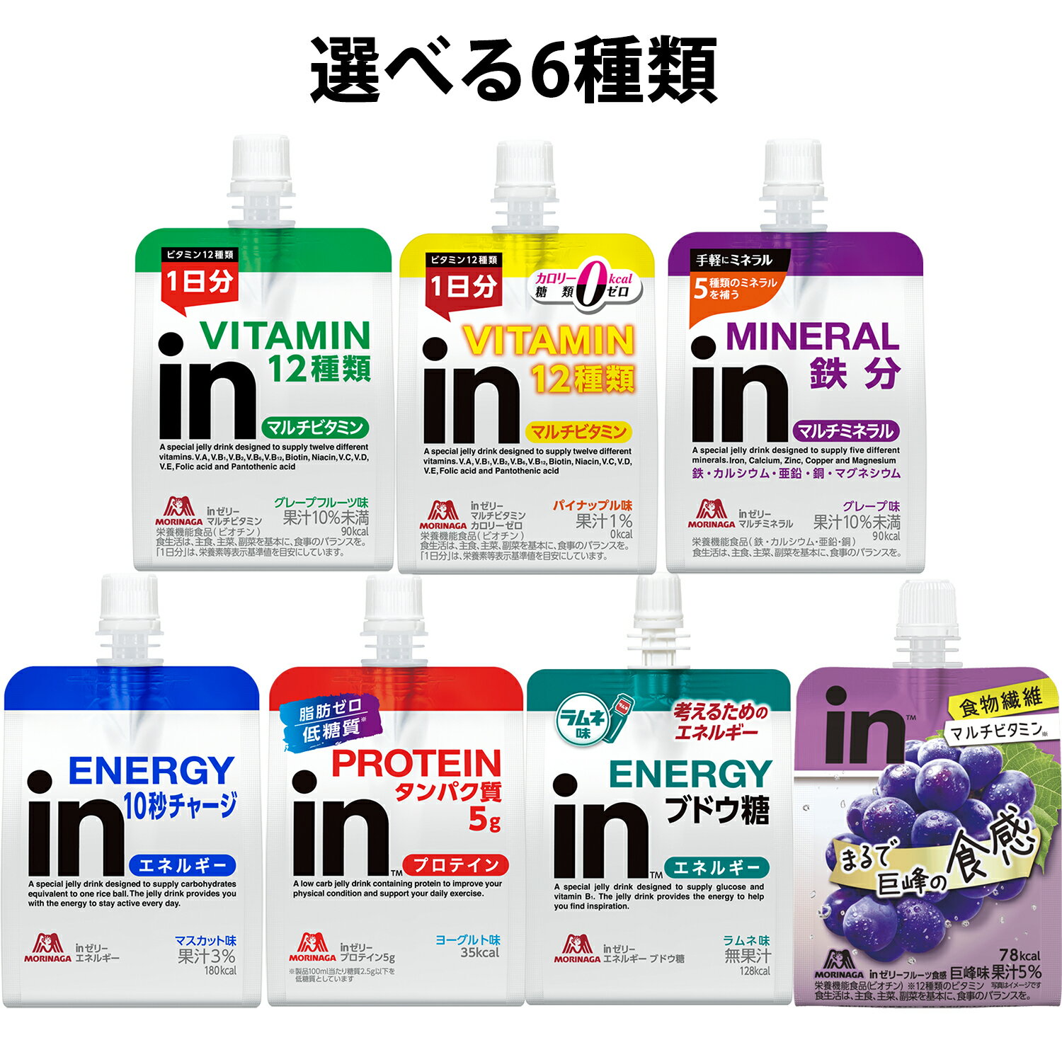 ■製品特徴 ●エネルギー:10秒チャージ。素早いエネルギー補給に! 180kcal / マスカット味 ・ビタミンC配合 ・180kcalでおにぎりおよそ1個分 inゼリーブランドの象徴とも言えるロングセラー商品。おにぎり1個分のエネルギーが手軽に補給できます。1日のスタートに!運動前に!など短時間でエネルギーを補給したい時にオススメです!常温でもおいしく頂けるよう設計しているので、スポーツシーンはもちろん、非常食としてもご活用頂けます。 ●マルチビタミン【栄養機能食品(ビオチン)】:12種類のビタミン、1日分摂取 90kcal / グレープフルーツ味 ・1日分※のビタミン12種類を配合。 ※栄養素等表示基準値を目安にしています ・おいしく小腹が満たせるゼリー飲料 ビタミンは食事内容によっては不足しやすい栄養素のため、食事バランスが気になる日におすすめです。 1個90kcalで1日分のビタミンが補え、さらには小腹満たしにもなるので、スポーツ現場だけでなく、普段の生活での間食にもおすすめです。 アスリートは、海外遠征等で食事が乱れる場合があるので、1日分のビタミンが1個で補えるゼリーは、遠征時も持ち運びやすいので、とてもありがたいですね。 ●マルチビタミンカロリーゼロ【栄養機能食品(ビオチン)】:カロリー、糖類を摂らずに12種類のビタミン、1日分摂取 0kcal / パイナップル味 ・1日分※のビタミン12種類を配合。 ※栄養素等表示基準値を目安にしています ・カロリーは摂らずに、おいしく小腹が満たせるゼリー飲料 ・カロリー、糖類ゼロ 食事バランスが偏ったり、減量を目指して食事量を減らしていたりする場合にビタミンが不足してしまう可能性があり、また運動量が増える場合には、必要量が増えるビタミンもあります。ビタミンが不足することで体調などに変化が出る可能性があるため、不足しないよう摂取することが重要です。inゼリーマルチビタミンカロリーゼロは、0kcal、糖類0の特徴があり、甘さと食べ応えを感じるパイナップル味です。 ●マルチミネラル【栄養機能食品(鉄、カルシウム、亜鉛、銅)】:5種類のミネラル(鉄、カルシウム、亜鉛、銅、マグネシウム)を手軽に補給 90kcal / グレープ味 ・5種類のミネラル配合(鉄、カルシウム、亜鉛、銅、マグネシウム) ・栄養機能食品(鉄、カルシウム、亜鉛、銅) 5種類のミネラルが手軽に摂れるグレープ味がおいしいゼリーです!1日に必要なミネラルの1/3(※マグネシウム以外)が補給できるので、レバーが苦手な方や大豆製品が不足がちな方に手軽な鉄分補給としてご活用ください。女性アスリートや、ランナーに人気の高い商品です! ●プロテイン5g:低糖質※・脂肪ゼロ!手軽においしいプロテイン※製品100ml当たり糖質2.5g以下を低糖質としています 35kcal / ヨーグルト味 ・タンパク質5g配合 ・低糖質 ※製品100ml当たり糖質2.5g以下を低糖質としています ゼリー1袋で5gのタンパク質が入っています。これは、牛乳コップ1杯分(150ml)のタンパク質量とほぼ同量ですが、低糖質※1・脂質ゼロ※2であることから、なるべくタンパク質のみを摂取したい方にオススメです。減量時の補食や普段の食事でタンパク質量を増やしたい方は活用してみてはいかがでしょうか。 ※1 製品100ml当たり糖質2.5g以下を低糖質としています。 ※2 食品表示基準による ●フルーツ食感 巨峰:まるで本物の巨峰を食べているような食感が楽しめる♪ 食物繊維・マルチビタミン※配合※12種類のビタミン 78kcal / 巨峰味 ・まるで果物の食感と甘み ・食物繊維5g ・1食分※のマルチビタミン(12種類のビタミン) ※栄養素等表示基準値を目安にしています ・150g 本物の巨峰を食べているような食感と味が特徴のゼリーです。 1個で1食分のマルチビタミンが配合されているので、普段ビタミン不足が気になる方におすすめです! 食物繊維も5g含まれていますので、小腹が空いた時の間食にご活用ください。 ■原材料名 <エネルギー> 液状デキストリン(国内製造)、果糖ぶどう糖液糖、マスカット果汁/酸味料、乳酸Ca、ゲル化剤(増粘多糖類)、V.C、香料、塩化K、乳化剤、パントテン酸Ca、ナイアシン、V.E、V.B1、V.B2、V.B6、V.A、葉酸、V.D、V.B12 <マルチビタミン>【栄養機能食品(ビオチン)】 果糖ぶどう糖液糖(国内製造)、グレープフルーツ果汁、砂糖/酸味料、香料、乳酸Ca、ゲル化剤(増粘多糖類)、V.C、塩化K、ナイアシン、パントテン酸Ca、乳化剤、V.E、V.B1、V.B2、V.A、V.B6、葉酸、ビオチン、V.D、V.B12 <マルチビタミンカロリーゼロ>【栄養機能食品(ビオチン)】 エリスリトール(中国製造)、パインアップル果汁、食塩/香料、酸味料、ゲル化剤(増粘多糖類)、乳酸Ca、V.C、塩化K、甘味料(スクラロース、アセスルファムK)、ナイアシン、パントテン酸Ca、V.E、乳化剤、V.B1、V.B2、V.A、V.B6、葉酸、ビオチン、V.D、V.B12 <マルチミネラル>【栄養機能食品(鉄、カルシウム、亜鉛、銅)】 グレープ果汁(チリ製造)、砂糖、水あめ/乳酸Ca、酸味料、ゲル化剤(増粘多糖類)、硫酸Mg、香料、塩化K、甘味料(アセスルファムK、スクラロース