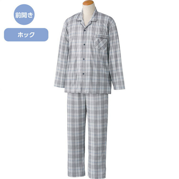 パジャマ メンズ 長袖 ホックパジャマ (上下セット) 800715 M L ケアファッション │ 寝巻き ねまき 前開き 男性 紳士 シニア 介護 高齢者 オールシーズン 通年素材 留めやすい ホックボタン 脱ぎやすい 着やすい 長ズボン チェック柄 プレンゼント 2025AW