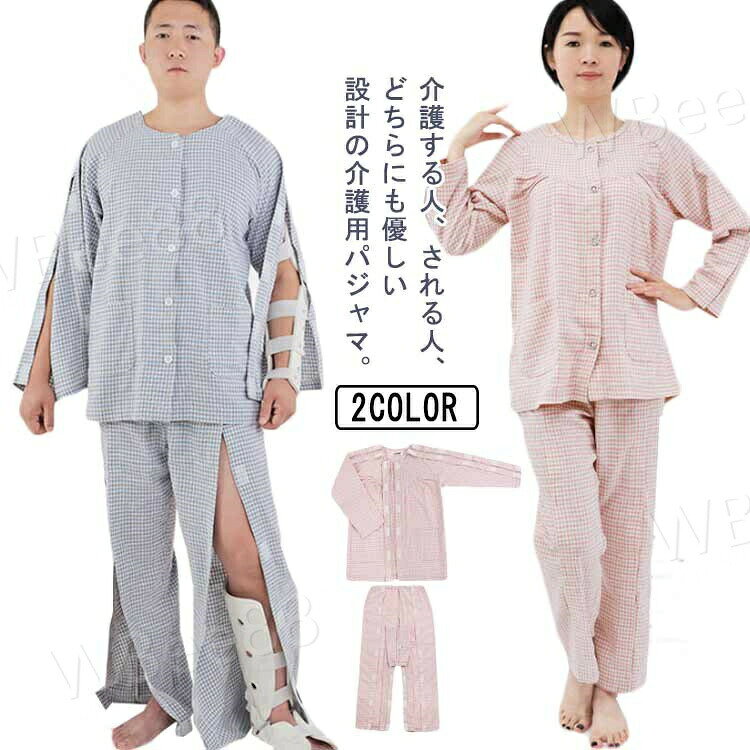 介護する人、される人、どちらにも優しい設計の介護用パジャマ。肩から袖口までの中央部分にマジックテープが付いております。ボタンの下がマジックテープで手に力の入らない方でも簡単に開閉ができます。マジックテープはウエスト部分から裾までの中央部分に付いており、着脱が簡単。両サイドにポケットが付きなので、スマホや小物とか入れると便利です。締め付けすぎないウエストゴムで、履き心地も抜群です。半身まひ、リウマチ、手の不自由な方や、骨折や肩などの治療、手術後にも。サイズ女性モデル:身長162cm体重46kg 着用しているのはMサイズです。男性モデル:身長170cm体重70kg 着用しているのはLサイズです。素材コットン色男性-ブルー 女性-ピンク備考サイズ詳細等の測り方はスタッフ間で統一、徹底はしておりますが、実寸は商品によって若干の誤差(1cm~3cm )がある場合がございますので、予めご了承ください。商品の色は、撮影時の光や、お客様のモニターの色具合などにより、実際の商品と異なる場合がございます。あらかじめ、ご了承ください。製品によっては、生地の特性上、洗濯時に縮む場合がございますので洗濯時はご注意下さいませ。▼色味の強い製品によっては他の衣類などに色移りする場合もございますので、速やかに(脱水、乾燥等)するようにお願いいたします。▼生地によっては摩擦や汗、雨などで濡れた時は、他の製品に移染する恐れがございますので、着用の際はご注意下さい。▼生地の特性上、やや匂いが強く感じられるものもございます。数日のご使用や陰干しなどで気になる匂いはほとんど感じられなくなります。介護する人、される人、どちらにも優しい設計の介護用パジャマ。肩から袖口までの中央部分にマジックテープが付いております。ボタンの下がマジックテープで手に力の入らない方でも簡単に開閉ができます。マジックテープはウエスト部分から裾までの中央部分に付いており、着脱が簡単。両サイドにポケットが付きなので、スマホや小物とか入れると便利です。締め付けすぎないウエストゴムで、履き心地も抜群です。半身まひ、リウマチ、手の不自由な方や、骨折や肩などの治療、手術後にも。サイズ女性モデル:身長162cm体重46kg 着用しているのはMサイズです。男性モデル:身長170cm体重70kg 着用しているのはLサイズです。素材コットン色男性-ブルー 女性-ピンク備考サイズ詳細等の測り方はスタッフ間で統一、徹底はしておりますが、実寸は商品によって若干の誤差(1cm~3cm )がある場合がございますので、予めご了承ください。商品の色は、撮影時の光や、お客様のモニターの色具合などにより、実際の商品と異なる場合がございます。あらかじめ、ご了承ください。製品によっては、生地の特性上、洗濯時に縮む場合がございますので洗濯時はご注意下さいませ。▼色味の強い製品によっては他の衣類などに色移りする場合もございますので、速やかに(脱水、乾燥等)するようにお願いいたします。▼生地によっては摩擦や汗、雨などで濡れた時は、他の製品に移染する恐れがございますので、着用の際はご注意下さい。▼生地の特性上、やや匂いが強く感じられるものもございます。数日のご使用や陰干しなどで気になる匂いはほとんど感じられなくなります。