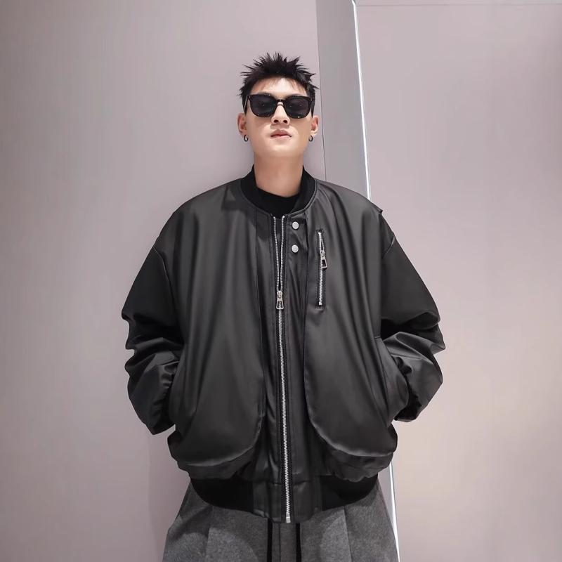 ジャケット 男性用 アメリカンレトロスタイル 肩パッド ゆったりめ ジップアップ ショート丈 ブルゾン 普段使い ポリエステル グレー ブラック 春秋