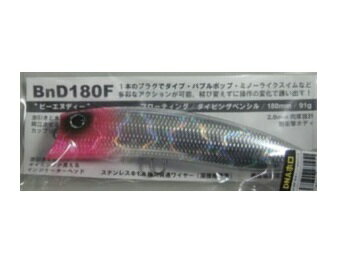 グッドベイト/GOOD BAITビーエヌディー/BnD 180F◆全長:180mm◆重量:91g◆ルアータイプ:フローティングダイビングペンシル★ショアでもオフショアでも、1人のアングラーが1度にキャストできるルアーは1本。ならばその1本が操作方法によってダイビングペンシルであったり、スリムポッパーの様に泡を引き込ませたり、ミノーの様に水面直下を泳がせる事ができれば、1投のキャストでルアーを交換せずとも様々なアクションで誘い出すことができるのではないだろうか。究極としてはワンキャストの中で「注目させる」「追わせる」「喰わせる」を別々のアクションで使い分けられるそんなルアーが欲しい。それを形にしたのがBnD(ビーエヌディー)です。