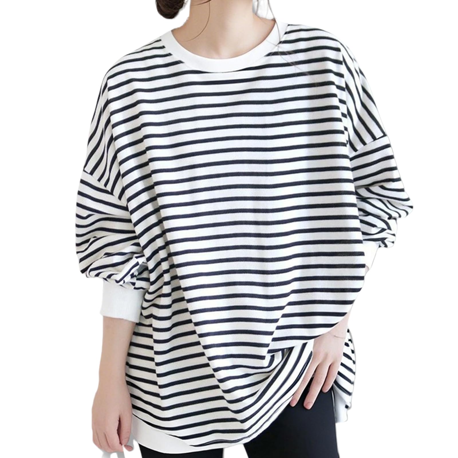 【送料無料】[R10righten] トップス トレーナー レディース スウェット プルオーバー ストライプ 長袖 薄手 ビッグシルエット 大きいサイズ ゆったり 体型カバー シンプル カジュアル ファッション 春 秋 普段着 色:グレー、サイズ:L