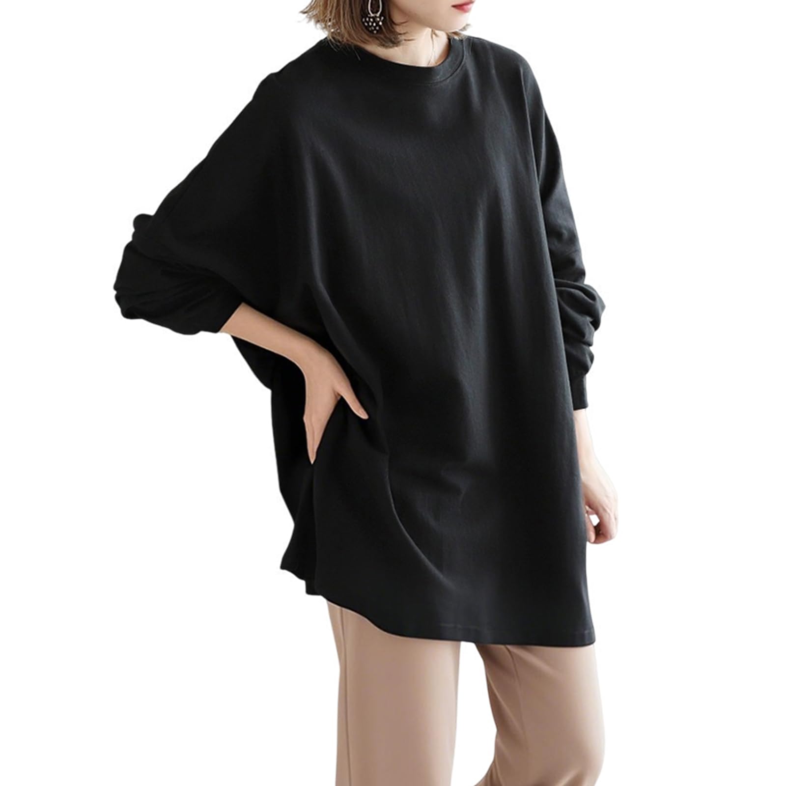 【送料無料】[AOY] トレーナー レディース オーバーサイズ 【ゆるっと着こなす重ね着・5サイズ&14色】 長袖 トップス 体型カバー 大きいサイズ ゆったり 着せ 綿 着回し カジュアル ビッグシルエット 無地 おしゃれ シンプル 長め スウェット 色:ブラック、サイズ:M