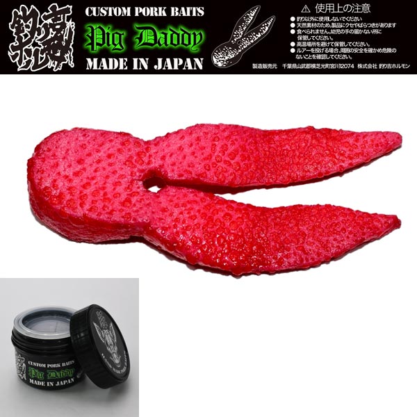 釣り吉ホルモンからポークルアーピッグダディー(豚親父)が誕生! 釣り吉ホルモンのポークルアーは1つずつハンドメイドで仕上げられています。 原料を厳選し、素材そのものの柔らかさで作られているため、軟化剤で柔らかくしたポークにありがちな針持ちの悪さや素材そのものの耐久性の悪さを解消しています。 今までのポークルアーとはひと味違うピッグダディーを使ってみて下さい! バイトの多さとビックフィッシュ捕獲率にあなたも驚くことでしょう!