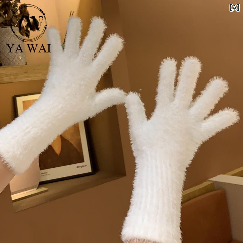 ニット手袋 ホワイト ニットの エクストラ ロング ウール イミテーション ラビットファー グローブ。 女性用 冬用 学生用 かわいい プラッシュ 暖かい サイクリング用 5本 指 防寒用。