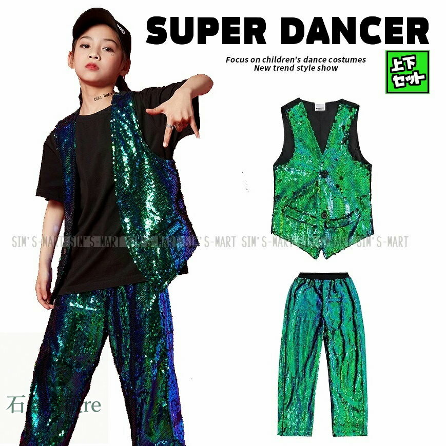 キッズダンス衣装 セットアップ ロックダンス衣装 ポッピン ジャズダンス スパンコール ベスト パンツ キラキラ ダンス衣装 緑