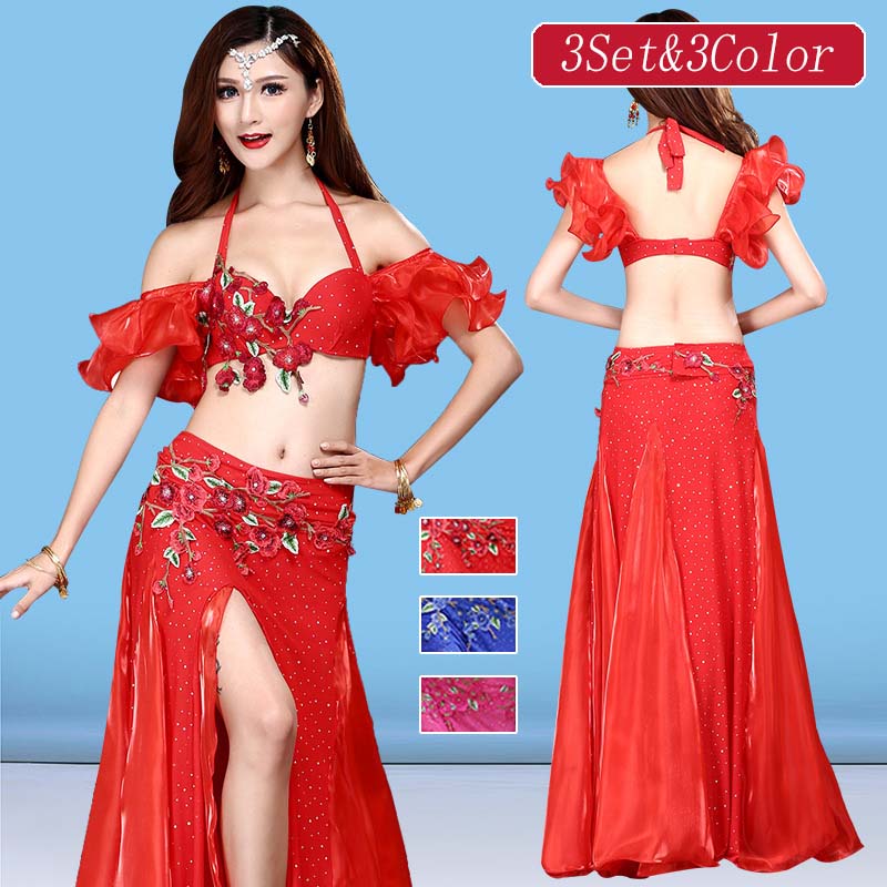 3色 ベリーダンス 衣装 セット ベリー 衣装 コスチューム ハロウィン コスプレ アラビアン仮装 パーティー アラビアン衣装 余興用 レッスン着 ヒップスカーフ スカート トップス レッド ローズピンク ネイビー 3点セット 社交ダンス