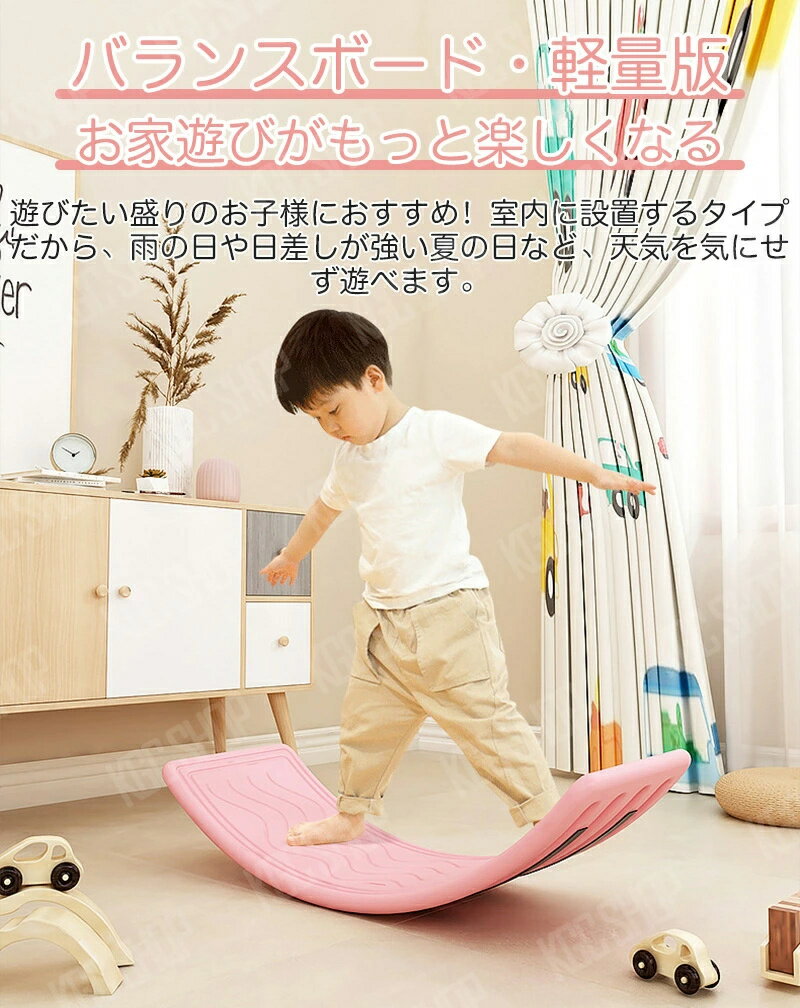 --商品詳細-- ★★★商品仕様★★★◎名称:バランスボード 子供 ◎重量:約1.7kg◎素材:PE◎おすすめ年齢:3歳以上 ◎カラー:4色◎サイズ:79*29*20cm★★★商品説明★★★◎ゆらゆら揺れている間に体幹を鍛えながら、子供のバランス感覚が養われます。◎また、体の使い方を身につけることで、運動機能の基礎を構築することにも有効です。◎室内外で使用が可能で、おうちあそびでも、外遊びでも活躍。ユラユラ揺れるだけで、隙間時間の運動不足解消にも役立ちます。◎お子様へのプレゼントには勿論、ギフトや贈り物としても最適です。 ◎お子さまのみならず、親御様にも使えますので親子で一緒に楽しく遊べます!また、お誕生日、入園・入学・卒業、クリスマス、こどもの日など様々なイベントにもマッチし、喜ばれること間違いなしです。この機会に是非プレゼントとして選んでみてはいかがでしょうか?★★★ご注意★★★※新品ですが、輸入品のため稀に汚れや傷等がある場合がございますが、ご了承下さい。※外観及び仕様は予告なく変更になる場合もございます。※モニターの発色により実際のものと色が異なる場合があります。※初期不良の場合、新品を交換することまたは返品が可能でございますので、お気軽にお問い合わせくださいませ。※本製品を使用して発生しうる、事故、損害、損傷、破損等、さらに二次的事故損害についても 弊社では一切の責任を負いかねます。★★★検索キーワード★★★【送料無料】軽量版 バランスボード 子供 体幹 トレーニング 室内遊び おうち遊び バランス おうち時間 室内遊具 室内運動 アスレチック インテリア ヨガ ボード ダイエット 運動不足 ストレス解消 幼児教育 知育玩具 おもちゃ 誕生日 クリスマス プレゼント