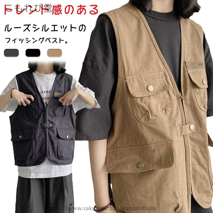 【全品2点で5%OFF】メンズ 羽織り 多機能 ルーズシルエット 多ポケット ベスト 春 秋 薄手 韓国風 渓流 ブラウン フィッシングベスト レディース ゆったり ストリート 男女兼用 アウトドア お釣り ミリタリー キャンプ 登山 原宿 おしゃれ 黒 紺 夏