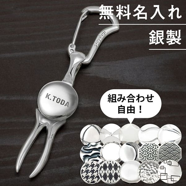ゴルフアクセ必須アイテム!! ゴルフ用の小物は色々ありますが、グリーンでのマナーに必須なのが「グリーンフォーク」 ベルトフープにひっかけ、キーチェーンのようなスタイルで楽しめます。 今回カラビナ(フック部分)を改良!一層取り外ししやすいタイプとなっています。 フォーク部分とカラビナを外すこともできるので、オリジナルコーデにもバッチリ! 完全シルバー製のこだわりのグリーンフォーク。 スッキリとしたデザインに仕上げているのでいろんなスタイルで楽しめます。 パンツにさり気なくセットし、ワンランク上の大人のオシャレを楽しみたい! センターには磁石があり、ボールマーカーをセットすることができます。 (※DAgDARTのボールマーカー専用です) 自分用としてはもちろん、退職のお祝いや、誕生日、父の日のギフト、贈答品、記念のお品などとしても需要が高いゴルフアイテム☆ 当店通販で人気上位!! ●別のセットもあります!! (※プルダウンから、ご希望のボールマーカーをお選びください。) メンズアクセブランドのDAgDART/ダグダートは、男性だけでなく女性にも楽しめるシルバーアクセアリーを1個1個丁寧に創りあげています。 アイテムキーワード #ホールインワン記念 #イーグル記念 #アルバトロス記念 #コンペ #幹事 #賞品 #景品 #記念品 #かっこいい #オシャレ #ゴルフ用品 #還暦祝い #ゴルフ好き #ゴルフ男子 #ゴルフ女子 #人気 #ワンランク上 #実用的 #実用品 #名入れ #刻印 #ネーム #父の日 #退職祝い #ギフト #人気 #オリジナル #dagdartGOLF #ダグダートゴルフ #クリスマス #誕生日 #贈答品 #贈り物 #マーカー #敬老の日 #925 #銀製 #シルバー #ドメスティック #マグネット #グリーンフォーク #カラビナ #ゴルフマーカー贈答用 #目立つ #高級神戸セレクションとは、神戸の産業の中から「神戸らしいお洒落で上質な商品」を発掘・選定して、全国へ発信する神戸ブランド企画です。 靴やスイーツが盛んな神戸ブランドの中から、dagdart GOLFのアイテムもこのたび「神戸セレクション」アイテムとして認定を受けました。 ご購入の流れ マーカーをお選びください 下記のゴルフマーカーから1種類お選びください。 ※マーカー画像をクリックで、ゴルフマーカー単品の商品ページへ移動します。 各ゴルフマーカーの裏面はマグネット(磁石)になっております。 お手持ちのハットクリップにセットしてご利用いただけます。 刻印の種類を選ぶ 各ゴルフマーカーの所定の位置に、名入れ・メッセージを刻印できます。 ※10文字まで、英数字のみ刻印可。空白、「.(ピリオド)」は文字数に含みません。 刻印書体サンプル例 ブロック体 筆記体 刻印の文字サイズについて 文字数により多少文字の大きさが異なります。バランスよくお入れいたしますのでお任せください。 刻印内容を決める 各マーカー刻印対応表 刻印内容をご明記ください 刻印商品の注意点 刻印をお入れした商品は返品・交換ができません。ご注意ください。 グリーンフォークとは グリーンフォークとは、グリーンにボールが落ちたときにできた凹みを直す道具です。 ボールマークを残した状態にしておくと、次に来るプレイヤーのパッティングの妨げになります。 グリーン上にできたボール跡、ボールマークを直すのはゴルファーのエチケットの一つです。 ゴルフの必需品なので、ゴルフアイテムのプレゼントとしても人気です。 磁石を埋め込んだグリーンフォーク ベルトフープにひっかけ、キーチェーンのようなスタイルで楽しめるグリーンフォークです。 フォーク部分とカラビナを外すこともできるので、オリジナルコーデにもバッチリ! センターには磁石をセット。ボールマーカーをセットすることができます。 (※DAgDARTのボールマーカー専用です) 完全シルバー製のこだわりのグリーンフォーク。 スッキリとしたデザインに仕上げているのでいろんなスタイルで楽しめます。 パンツにさり気なくセットし、ワンランク上の大人のオシャレを楽しみたい!そんな人にオススメです。 グリーンフォークの使い方 厚み 縦幅 横幅 重量 マーカー例 2.7mm 23.7mm 23.7mm 8.5g フォーク 10.4mm 115mm 25.5mm 32.8g 素材 Silver925 注意事項 ※刻印をお入れした商品は交換・返品不可※他ブランド商品のマグネットとは極性が反発する場合があります。