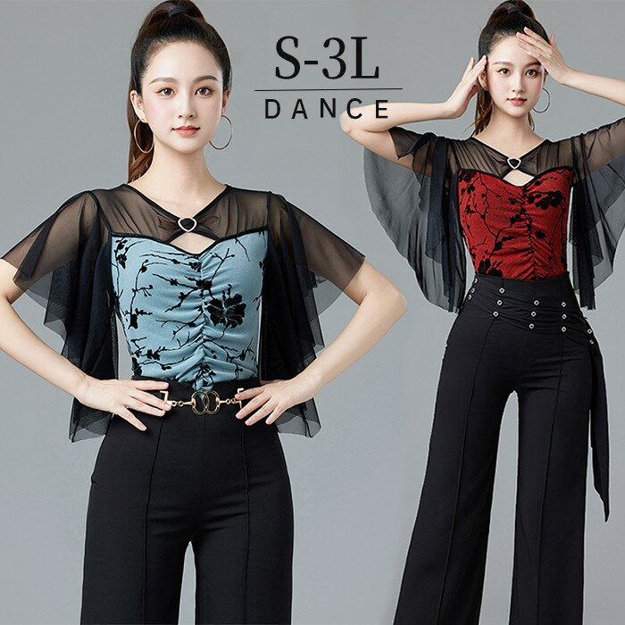 社交ダンス トップス レオタード 透け感 ブルー レッド フリル ダンス衣装 トップス ラテンダンス モダン タンゴ サンバ ダンスウェア レディース 社交ダンス衣装 コンサート 舞台用 ステージ衣装 練習着 レッスンウェア 黒 ブラック 胸パッド付き