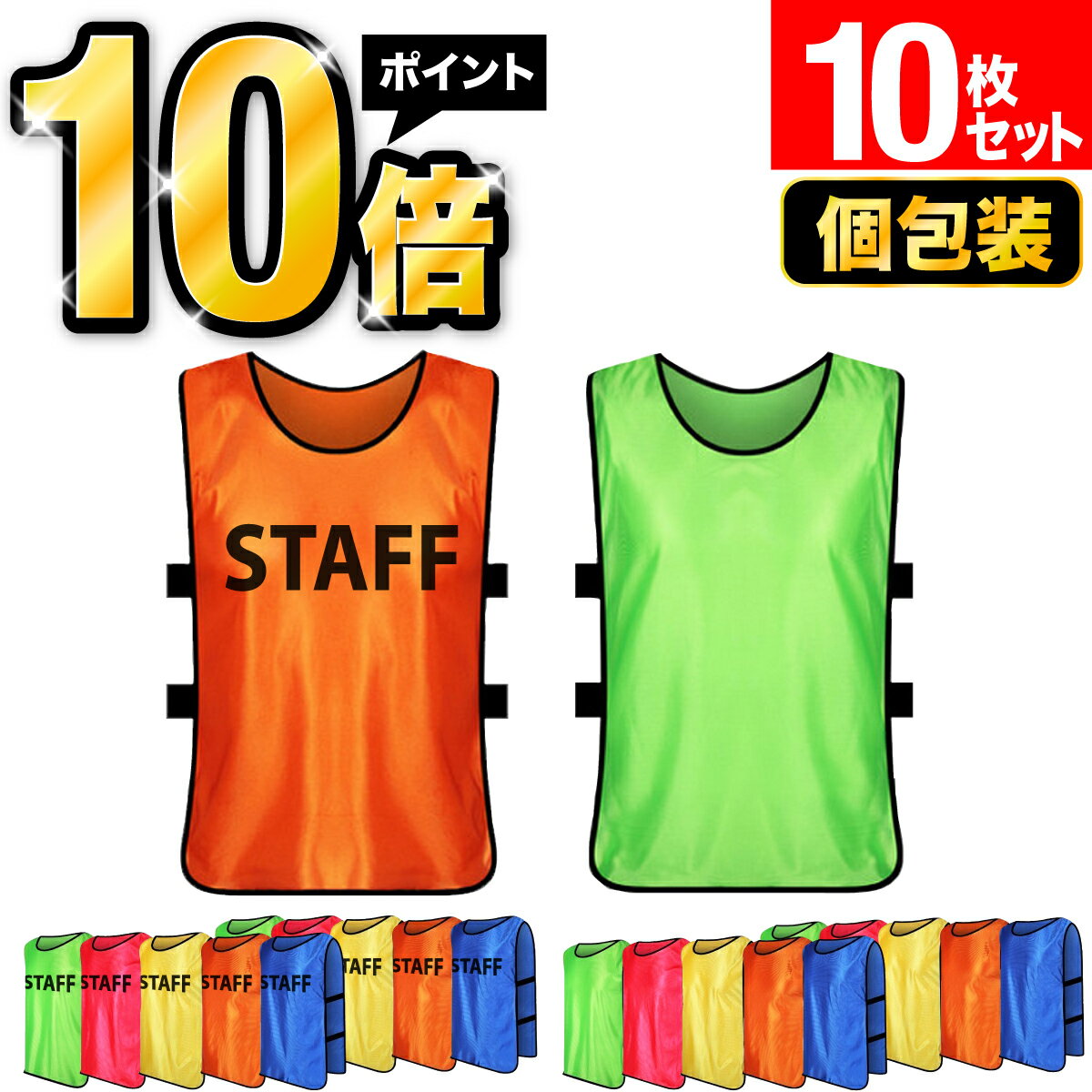 \楽天ポイント10倍!/ビブス スタッフビブス 10枚セット あす楽 STAFFビブス ネオンカラー ユニフォーム スタッフユニホーム ゼッケン イベント 大会運営 スポーツ大会 ライブ コンサート ボランティアスタッフ 夏祭り お祭り 交通誘導 町内会 駐車場係 サッカー バスケ