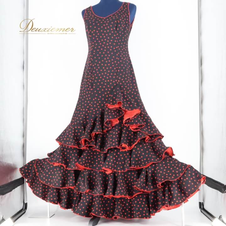 【中古】CANELA PURA フラメンコ 衣装 ワンピース ドレス ダンス衣装 パーティードレス レディース ダンス パーティ 発表会 ブラック系 レッド系 水玉 ドット ボランテ フリル フリルデザイン かわいい おしゃれ 可愛い レディース ステージ衣装 C031-2511022000605