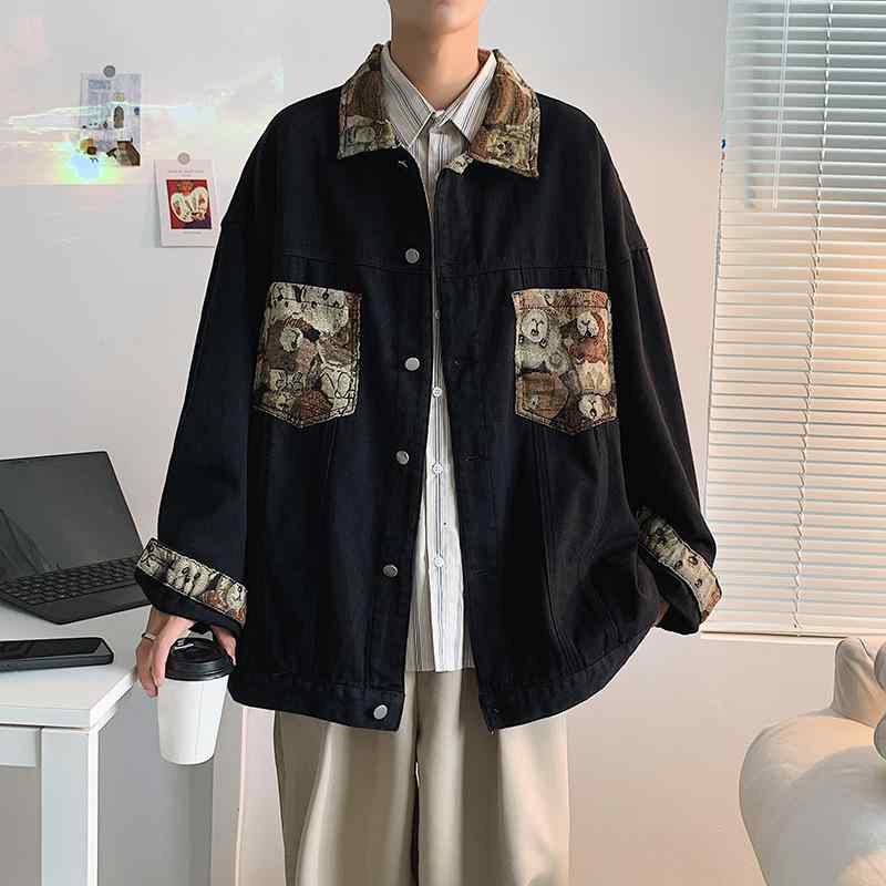 デニムジャケット メンズ 秋冬 ブルゾン ゆったり 韓国 カジュアル レトロ トップス 長袖 ブラック カーキ