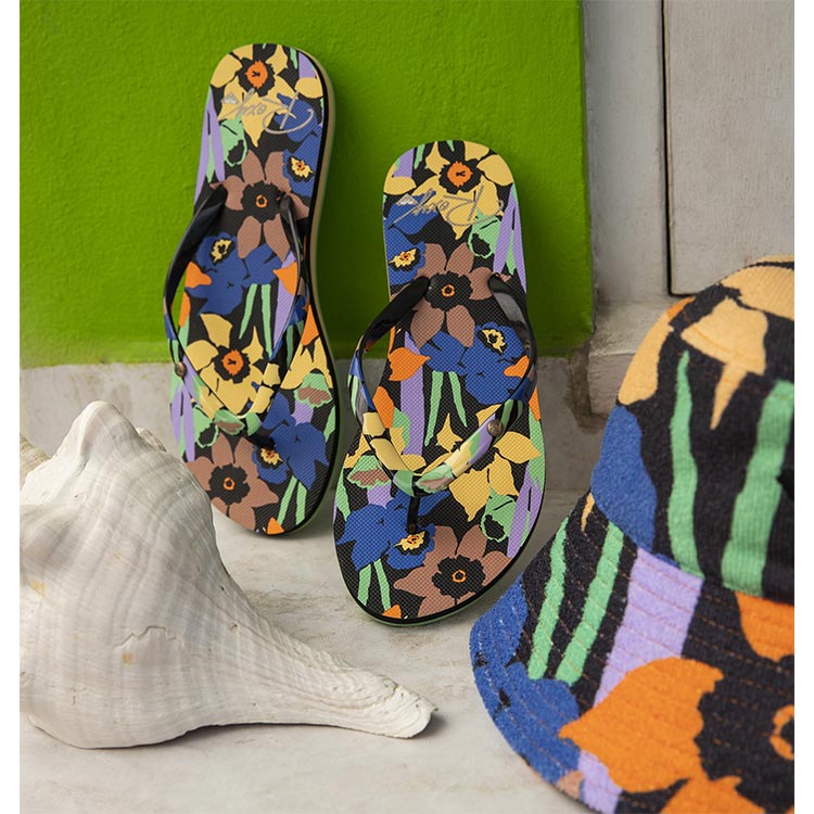 水着の柄とリンクした定番のビーチサンダルは、サマーシーズンのマストハブアイテム。PVCフリーのストラップにはプリントを施し、メタルのブランドマークピンをON。環境負荷の少ないインクを使ってプリントした、エココンシャスなアイテムです。