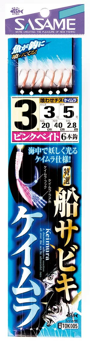 仕様表ケイムラフック&ケイムララメが海中でアピールSASAME TOK005ササメ TOK005 特選サビキ ピンクベイト ケイムラ●品番:TOK005●全長:2.8m●仕様:6本鈎×1セット●鈎、パーツ:喰わせチヌ(ケイムラ)/夜光玉(原色)/ケイムララメ糸使用●号数:5●ハリス:5●モトス:7詳細はこちら