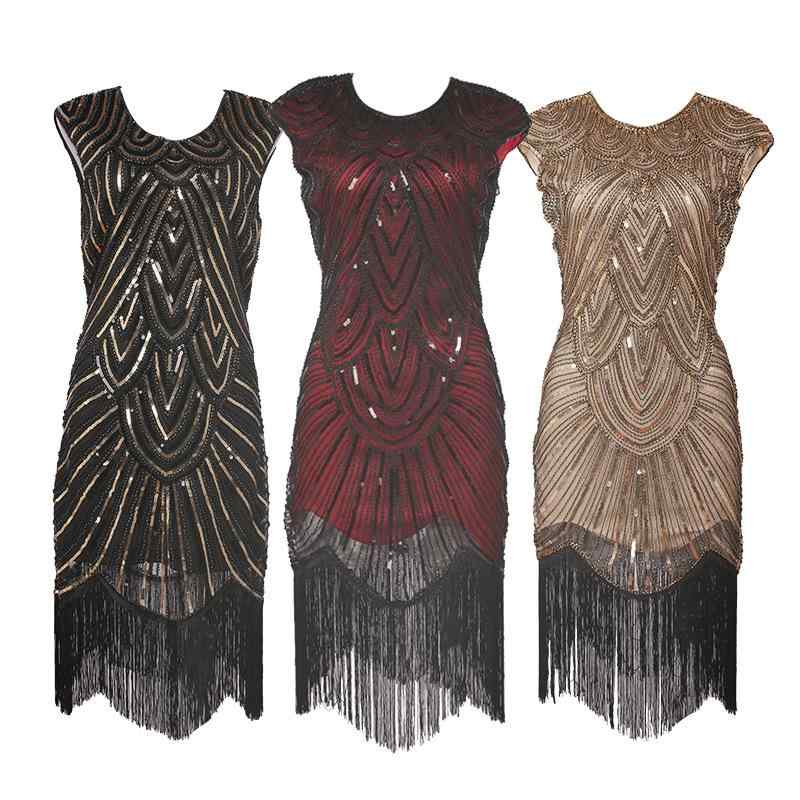 ドレス レディース レトロ ヴィンテージ風 スパンコール フリンジ ビーズ装飾 ゴージャス イブニングドレス 半袖 Uネック ローウエスト 結婚式 二次会 パーティー 謝恩会 披露宴 発表会 ゴールド