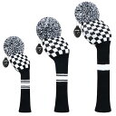 ゴルフ ヘッドカバー 3ピース ニット 1・3・5番ウッド対応 番号タグ付き かわいいポンポン おしゃれ 軽量 耐久性(Black White Plaid)