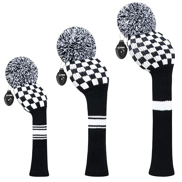 LeFeng Sports ゴルフ ヘッドカバー 3ピース ニット 1・3・5番ウッド対応 番号タグ付き かわいいポンポン おしゃれ 軽量 耐久性(Black White Plaid)
